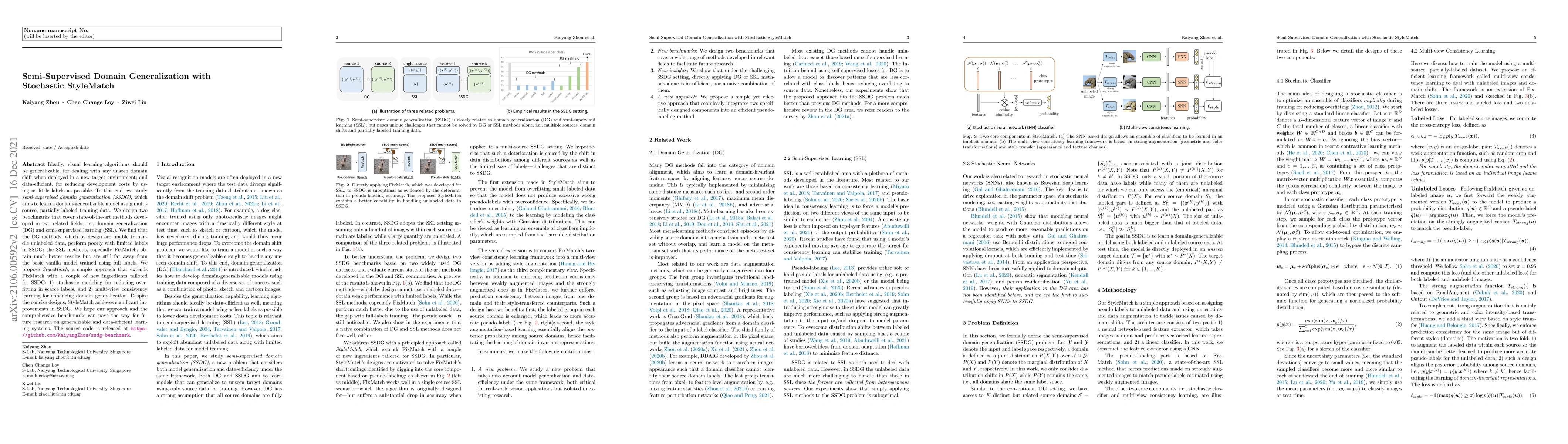 This paper proposes StyleMatch, a semi-supervised domain generalization method that combines stochastic modeling and multi-view consistency learning to improve performance with limited labeled data. The approach significantly outperforms existing domain generalization and semi-supervised learning methods on newly designed benchmarks.
