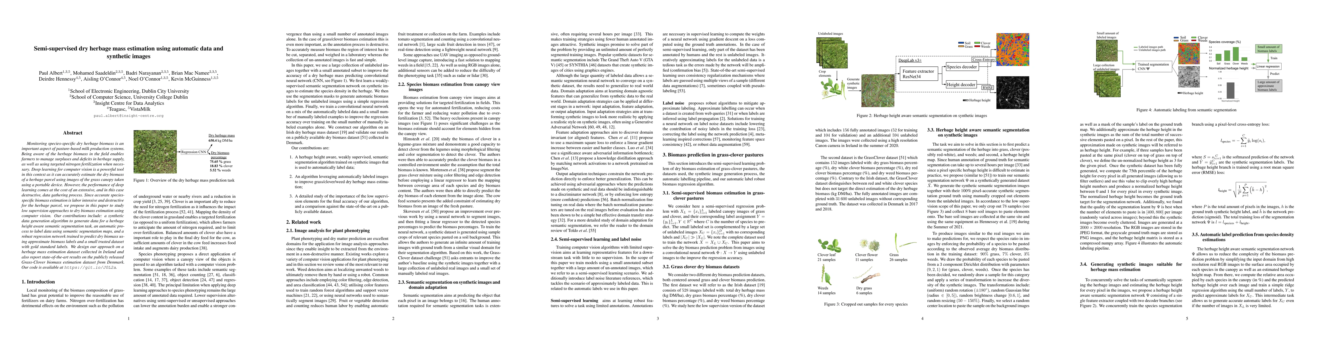 This paper proposes a semi-supervised deep learning approach for estimating dry herbage biomass using computer vision, leveraging synthetic data and automatic labeling to reduce the need for extensive, destructive data collection. The method includes a synthetic data generation algorithm, an automatic labeling process, and a regression network trained on approximate labels, achieving state-of-the-art results on two datasets.