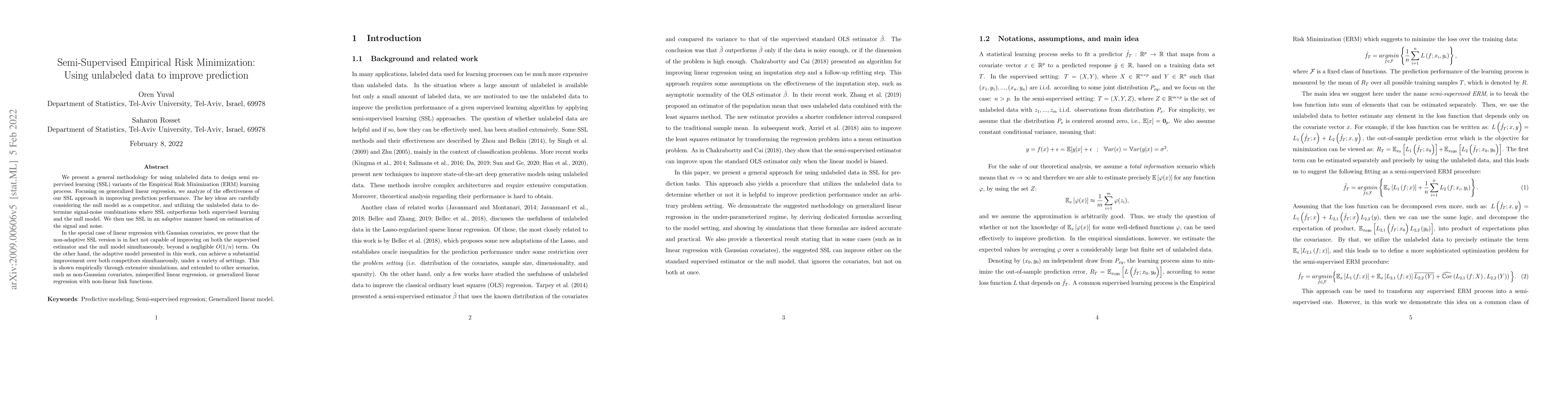 This paper proposes a semi-supervised learning methodology for Empirical Risk Minimization, leveraging unlabeled data to improve prediction performance in generalized linear regression. The adaptive approach significantly outperforms both supervised learning and null models, especially in scenarios with non-Gaussian covariates and misspecified linear regression.