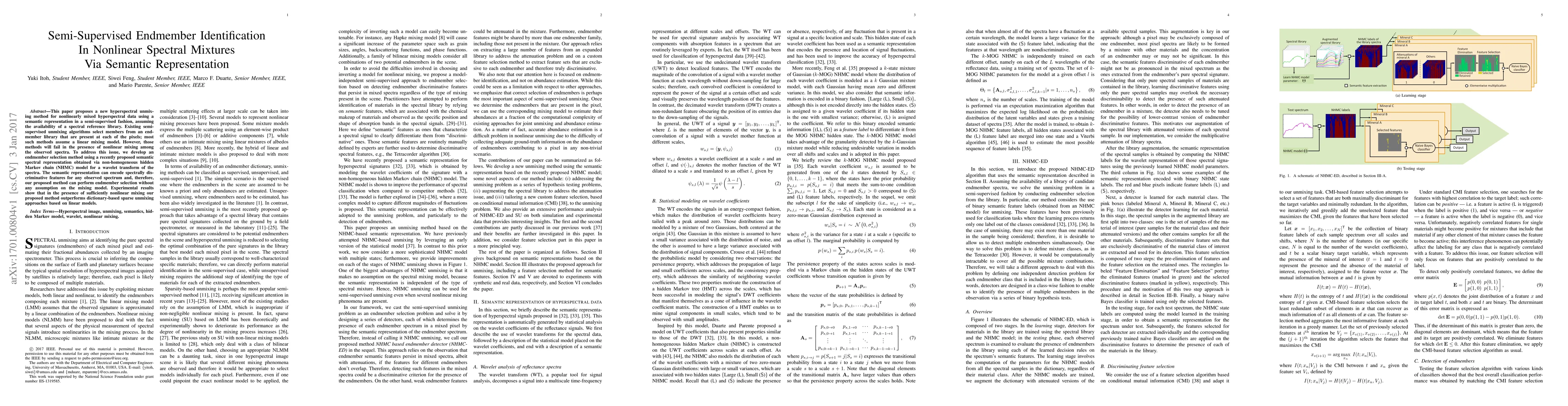This paper introduces a semi-supervised hyperspectral unmixing method for nonlinear spectral mixtures using semantic representation, outperforming linear model-based approaches in scenarios with nonlinear mixing. The method leverages a non-homogeneous hidden Markov chain model for wavelet transform spectra.