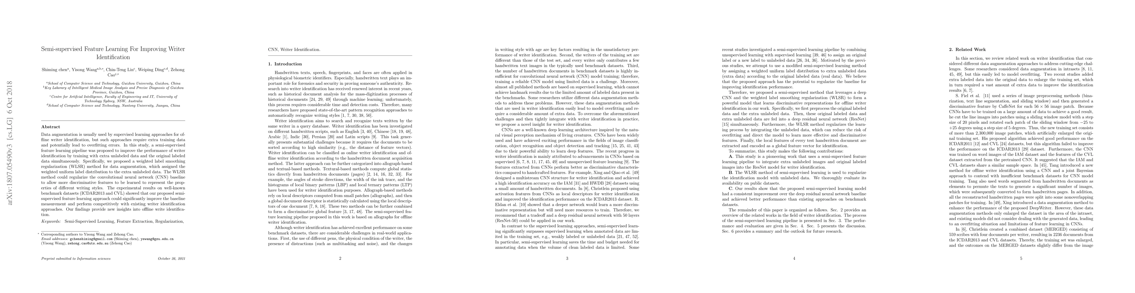 This paper proposes a semi-supervised feature learning method using weighted label smoothing regularization (WLSR) to enhance offline writer identification. The approach combines labeled and unlabeled data to improve CNN performance, achieving competitive results on ICDAR2013 and CVL datasets.