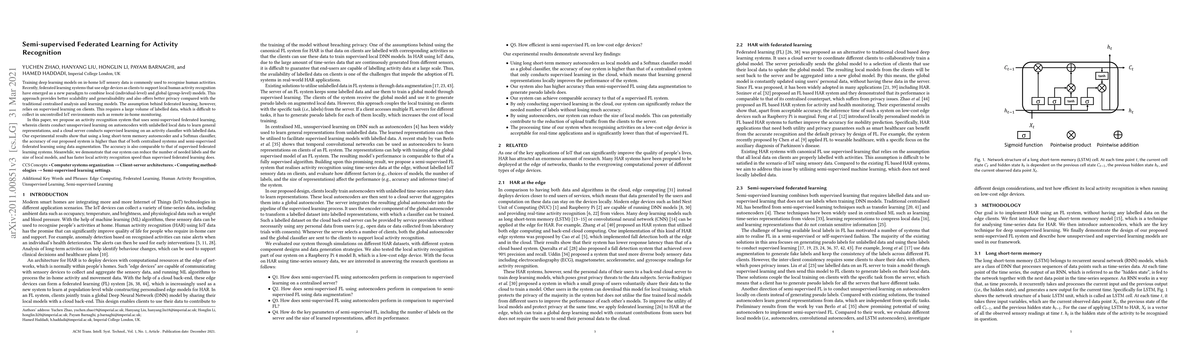 Training deep learning models on in-home IoT sensory data is commonly used to recognise human activities. Recently, federated learning systems that use edge devices as clients to support local human activity recognition have emerged as a new paradigm to combine local (individual-level) and global (group-level) models. This approach provides better scalability and generalisability and also offers better privacy compared with the traditional centralised analysis and learning models. The assumption behind federated learning, however, relies on supervised learning on clients. This requires a large volume of labelled data, which is difficult to collect in uncontrolled IoT environments such as remote in-home monitoring. In this paper, we propose an activity recognition system that uses semi-supervised federated learning, wherein clients conduct unsupervised learning on autoencoders with unlabelled local data to learn general representations, and a cloud server conducts supervised learning on an activity classifier with labelled data. Our experimental results show that using a long short-term memory autoencoder and a Softmax classifier, the accuracy of our proposed system is higher than that of both centralised systems and semi-supervised federated learning using data augmentation. The accuracy is also comparable to that of supervised federated learning systems. Meanwhile, we demonstrate that our system can reduce the number of needed labels and the size of local models, and has faster local activity recognition speed than supervised federated learning does.