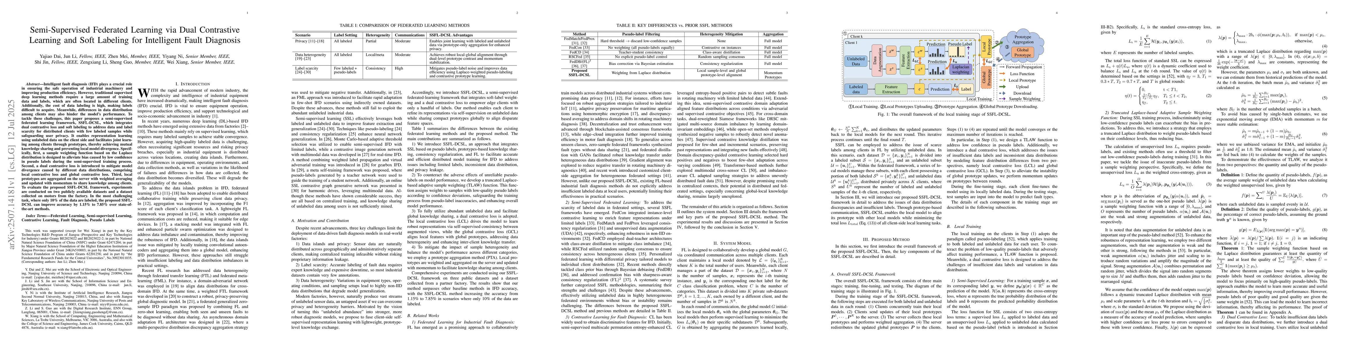 Intelligent fault diagnosis (IFD) plays a crucial role in ensuring the safe operation of industrial machinery and improving production efficiency. However, traditional supervised deep learning methods require a large amount of training data and labels, which are often located in different clients. Additionally, the cost of data labeling is high, making labels difficult to acquire. Meanwhile, differences in data distribution among clients may also hinder the model's performance. To tackle these challenges, this paper proposes a semi-supervised federated learning framework, SSFL-DCSL, which integrates dual contrastive loss and soft labeling to address data and label scarcity for distributed clients with few labeled samples while safeguarding user privacy. It enables representation learning using unlabeled data on the client side and facilitates joint learning among clients through prototypes, thereby achieving mutual knowledge sharing and preventing local model divergence. Specifically, first, a sample weighting function based on the Laplace distribution is designed to alleviate bias caused by low confidence in pseudo labels during the semi-supervised training process. Second, a dual contrastive loss is introduced to mitigate model divergence caused by different data distributions, comprising local contrastive loss and global contrastive loss. Third, local prototypes are aggregated on the server with weighted averaging and updated with momentum to share knowledge among clients. To evaluate the proposed SSFL-DCSL framework, experiments are conducted on two publicly available datasets and a dataset collected on motors from the factory. In the most challenging task, where only 10\% of the data are labeled, the proposed SSFL-DCSL can improve accuracy by 1.15% to 7.85% over state-of-the-art methods.