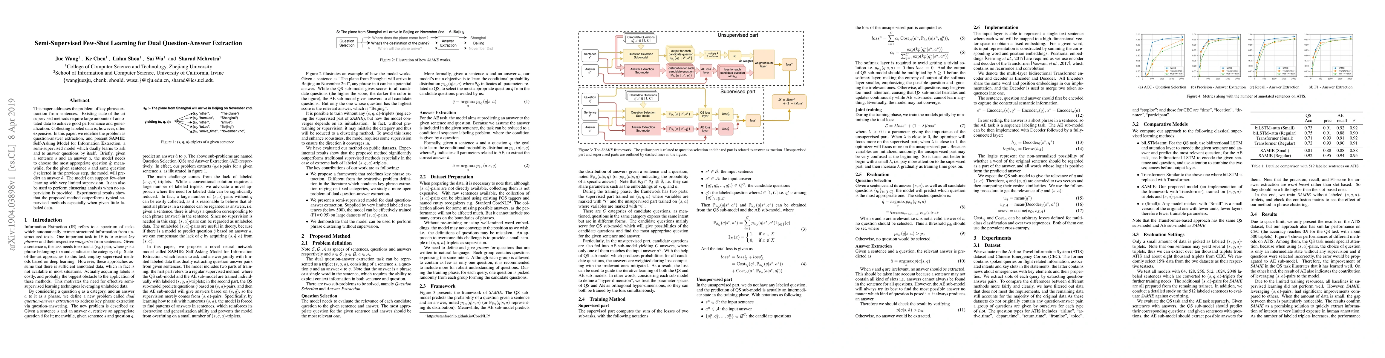 This paper introduces SAMIE, a semi-supervised few-shot learning model for dual question-answer extraction to extract key phrases from sentences, outperforming traditional supervised methods with limited labeled data. The model can also perform clustering analysis without supervision.