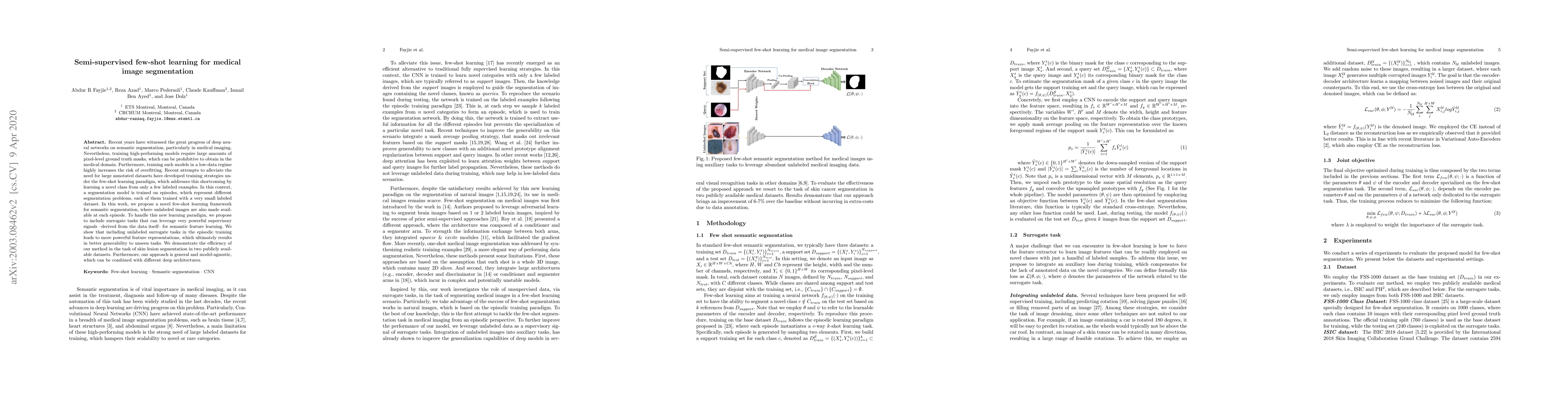 This paper proposes a novel semi-supervised few-shot learning framework for medical image segmentation, addressing the challenge of limited labeled data by incorporating unlabeled images and surrogate tasks to improve feature learning. The approach demonstrates better performance in skin lesion segmentation tasks on two datasets.