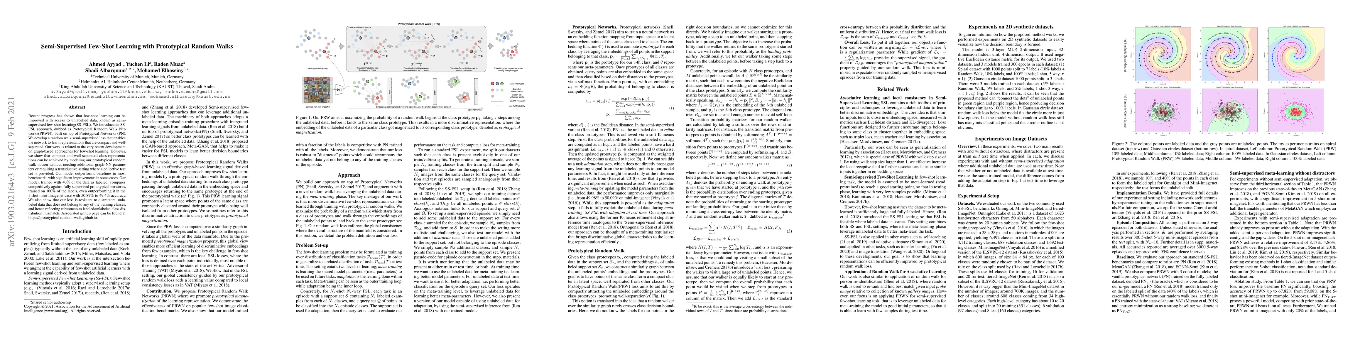 This paper introduces Prototypical Random Walk Networks (PRWN), a semi-supervised few-shot learning approach that leverages unlabeled data to improve performance. PRWN achieves compact and well-separated class representations through a random walk semi-supervised loss, outperforming baselines in benchmarks and demonstrating robustness against distractors.