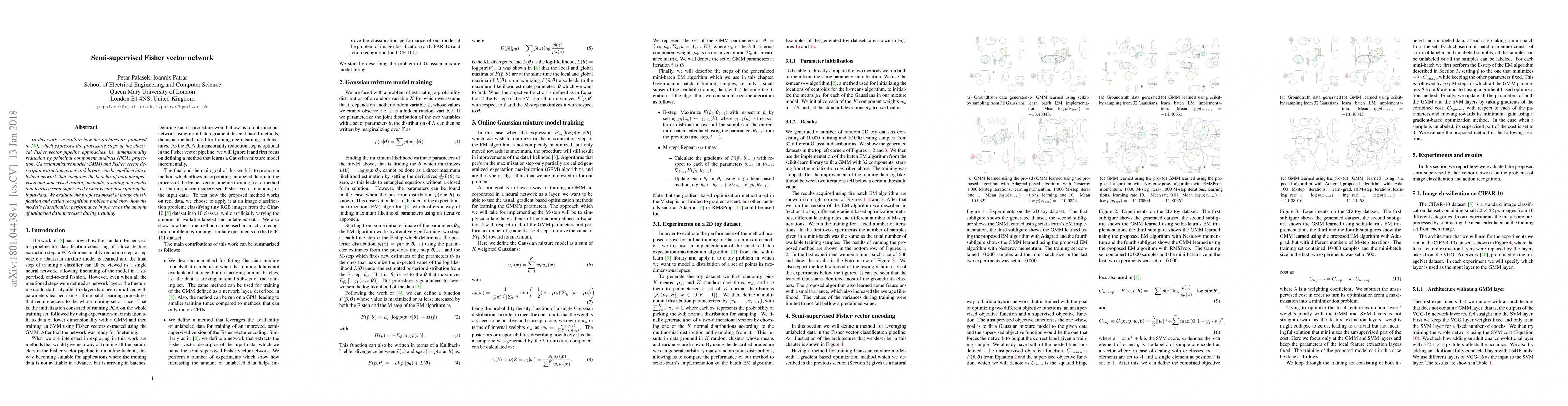 In this work we explore how the architecture proposed in [8], which expresses the processing steps of the classical Fisher vector pipeline approaches, i.e. dimensionality reduction by principal component analysis (PCA) projection, Gaussian mixture model (GMM) and Fisher vector descriptor extraction as network layers, can be modified into a hybrid network that combines the benefits of both unsupervised and supervised training methods, resulting in a model that learns a semi-supervised Fisher vector descriptor of the input data. We evaluate the proposed model at image classification and action recognition problems and show how the model's classification performance improves as the amount of unlabeled data increases during training.