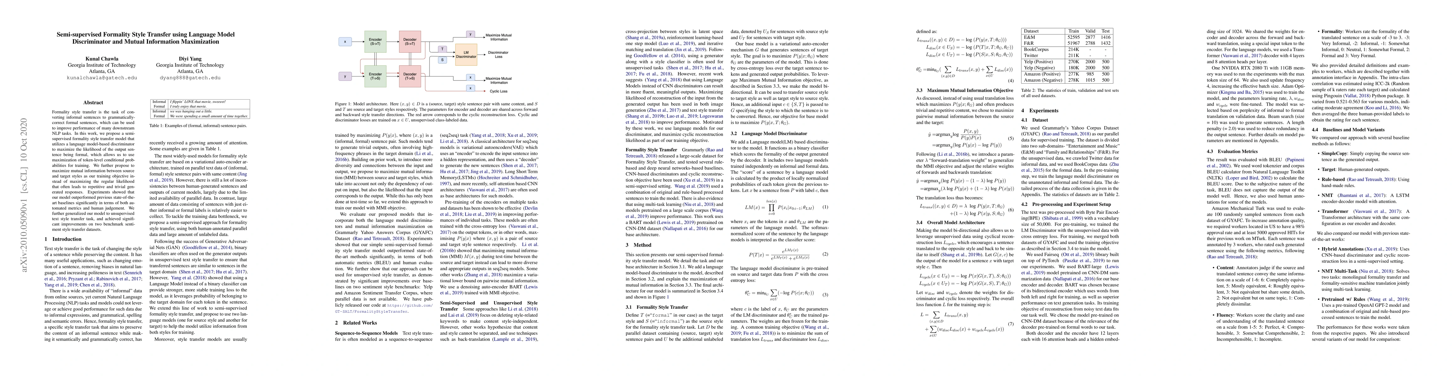 This paper proposes a semi-supervised model for formality style transfer using a language model-based discriminator and mutual information maximization, achieving superior performance over previous methods in both automated metrics and human evaluations. The model also extends to unsupervised style transfer, showing significant improvements on sentiment style datasets.