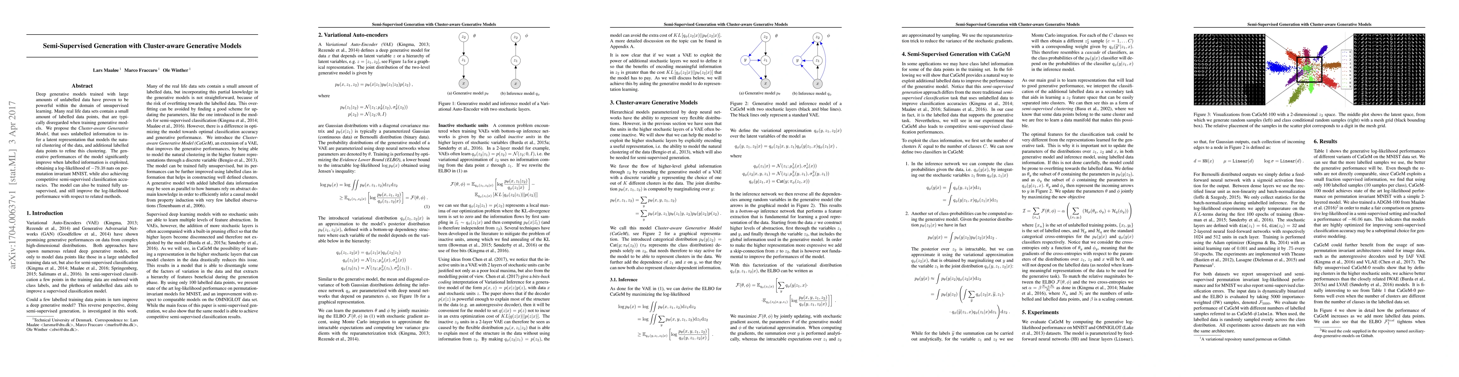 This paper proposes a Cluster-aware Generative Model that leverages unlabelled data to improve generative performance with labelled data, achieving competitive semi-supervised classification accuracies and log-likelihoods of -79.38 nats.