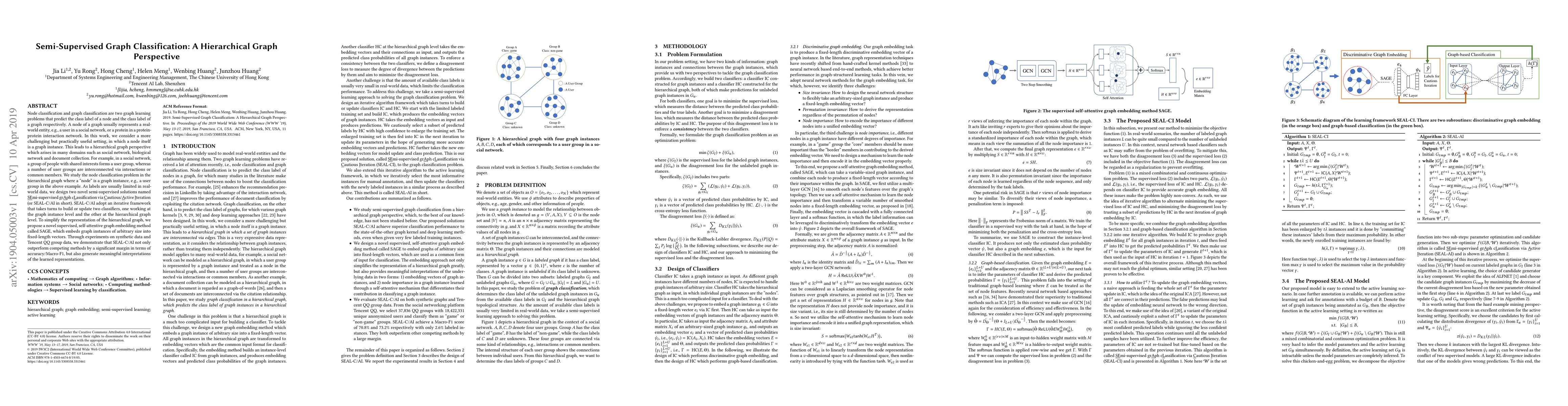 This paper proposes semi-supervised solutions for node classification in hierarchical graphs, where nodes are graph instances. The methods, SEAL-C/AI, iteratively build classifiers at different levels, and a new graph embedding method, SAGE, simplifies representation. Experiments show significant improvements over competing methods.