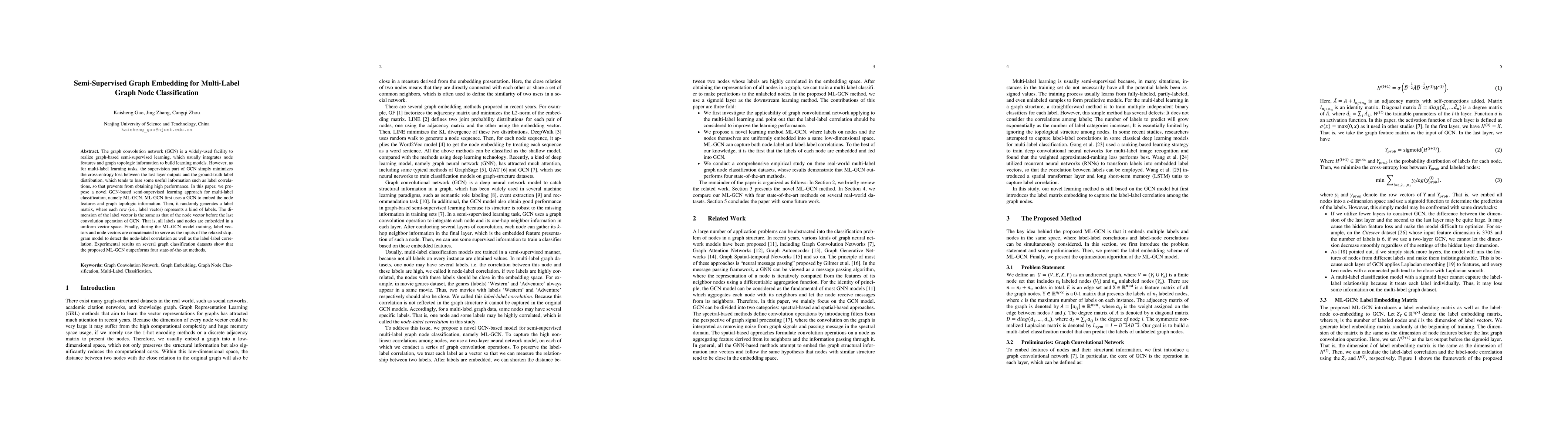 The paper introduces ML-GCN, a semi-supervised graph embedding approach that enhances multi-label graph node classification by leveraging graph convolution networks (GCN) to embed node features and graph topology, and a relaxed skip-gram model to detect node-label and label-label correlations, outperforming four state-of-the-art methods in experiments.