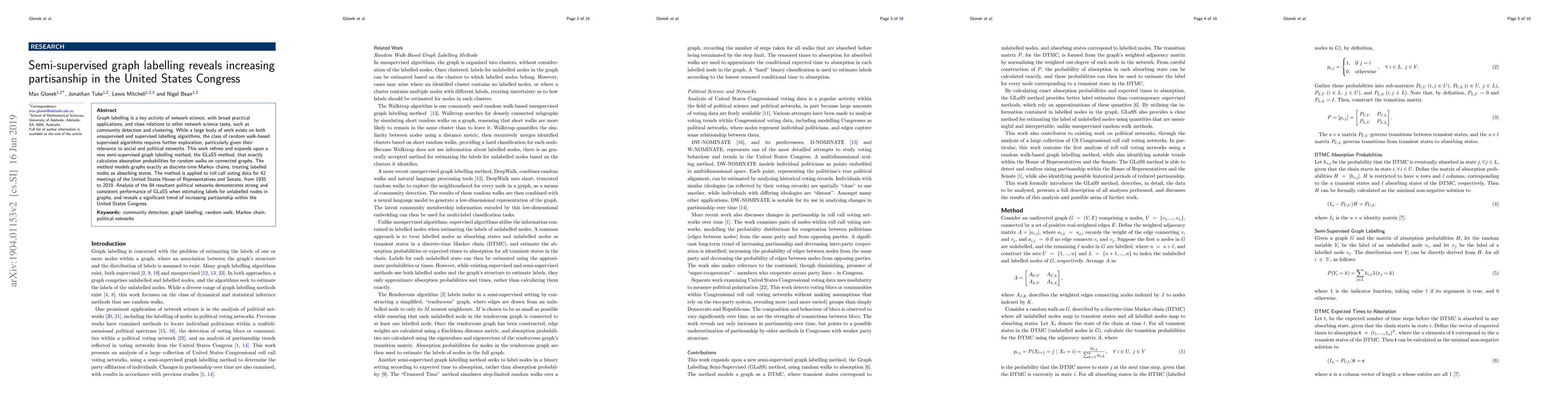 Graph labelling is a key activity of network science, with broad practical applications, and close relations to other network science tasks, such as community detection and clustering. While a large body of work exists on both unsupervised and supervised labelling algorithms, the class of random walk-based supervised algorithms requires further exploration, particularly given their relevance to social and political networks. This work refines and expands upon a new semi-supervised graph labelling method, the GLaSS method, that exactly calculates absorption probabilities for random walks on connected graphs. The method models graphs exactly as discrete-time Markov chains, treating labelled nodes as absorbing states. The method is applied to roll call voting data for 42 meetings of the United States House of Representatives and Senate, from 1935 to 2019. Analysis of the 84 resultant political networks demonstrates strong and consistent performance of GLaSS when estimating labels for unlabelled nodes in graphs, and reveals a significant trend of increasing partisanship within the United States Congress.