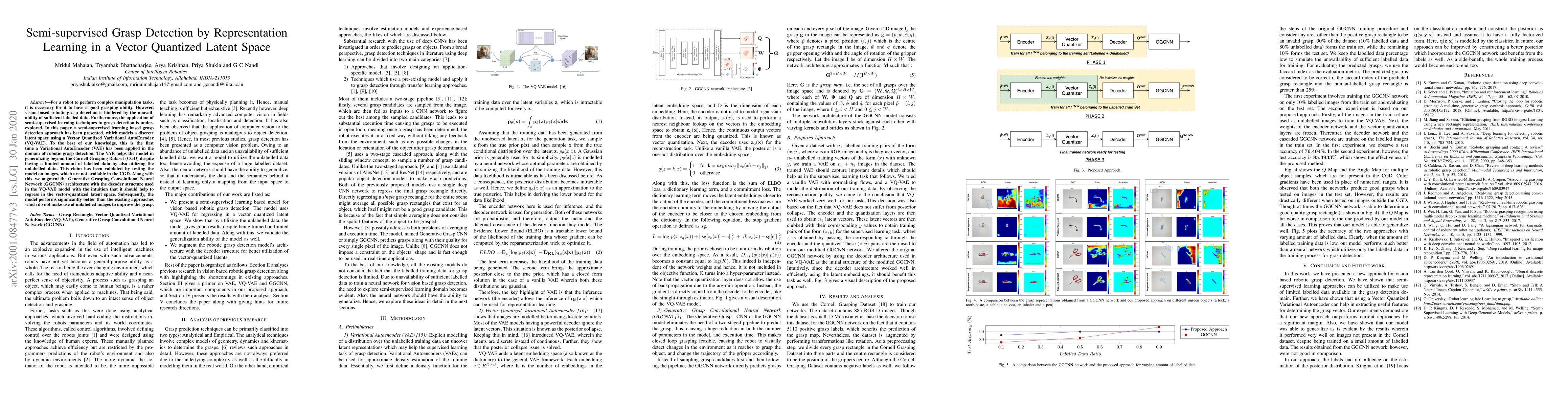 This paper introduces a semi-supervised learning method for robotic grasp detection using a Vector Quantized Variational AutoEncoder (VQ-VAE) to model a discrete latent space, enabling generalization beyond the Cornell Grasping Dataset despite limited labelled data. The approach combines the VQ-VAE decoder with a Generative Grasping Convolutional Neural Network (GGCNN) to achieve superior performance compared to existing methods.
