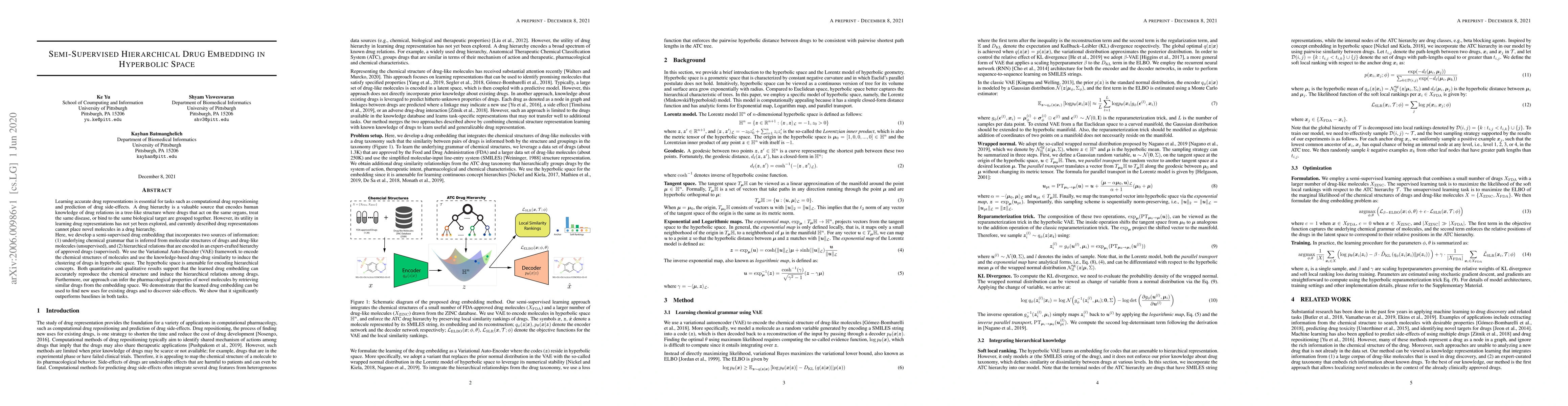 This paper develops a semi-supervised hierarchical drug embedding in hyperbolic space that leverages both chemical structure and hierarchical drug relations to accurately represent drugs. The approach outperforms baselines in drug repositioning and side-effect prediction, demonstrating the utility of hyperbolic space for encoding hierarchical concepts.