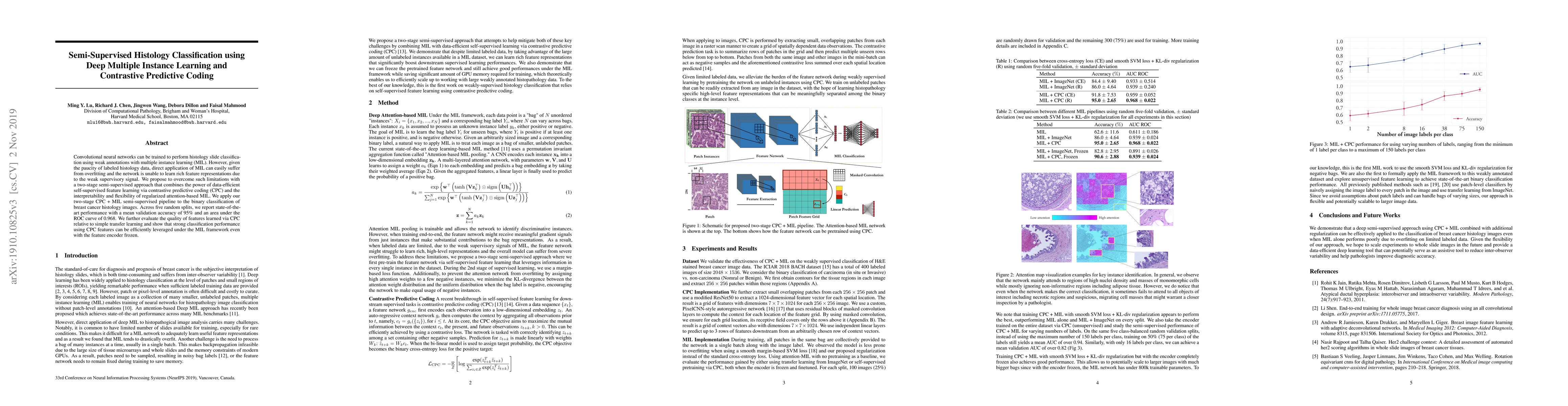 This paper proposes a semi-supervised method combining deep multiple instance learning (MIL) and contrastive predictive coding (CPC) to classify histology slides with limited labeled data, achieving state-of-the-art performance with 95% validation accuracy and 0.968 AUC. The approach leverages self-supervised learning to enhance feature representation, mitigating overfitting and improving classification.