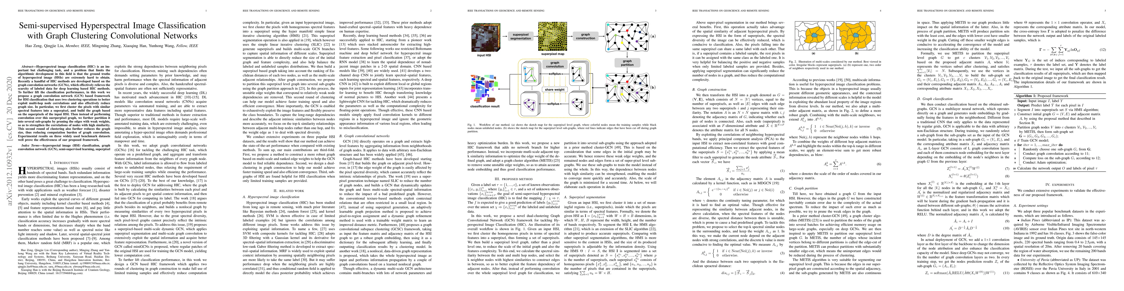 This paper proposes a semi-supervised hyperspectral image classification framework using graph convolution networks (GCNs) that employs two clustering steps to enhance node correlations and reduce graph size, thereby improving classification performance and computational efficiency. Experimental results demonstrate the effectiveness of the proposed method on benchmark datasets.