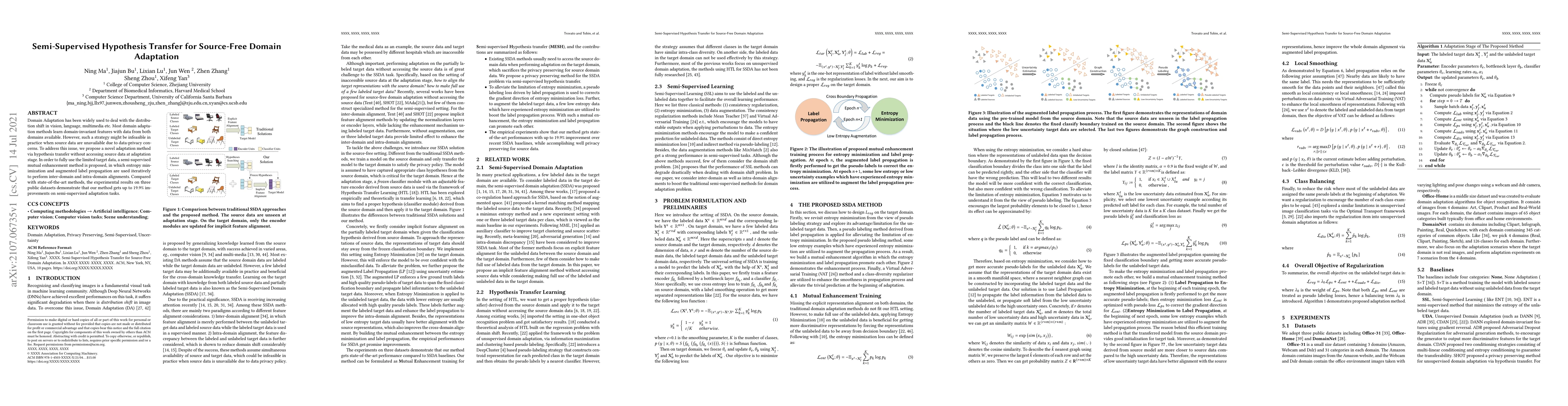 This paper proposes a novel semi-supervised hypothesis transfer method for source-free domain adaptation, leveraging entropy minimization and augmented label propagation to align domains without using source data. Experimental results show significant improvements of up to 19.9% on semi-supervised adaptation tasks compared to state-of-the-art methods.