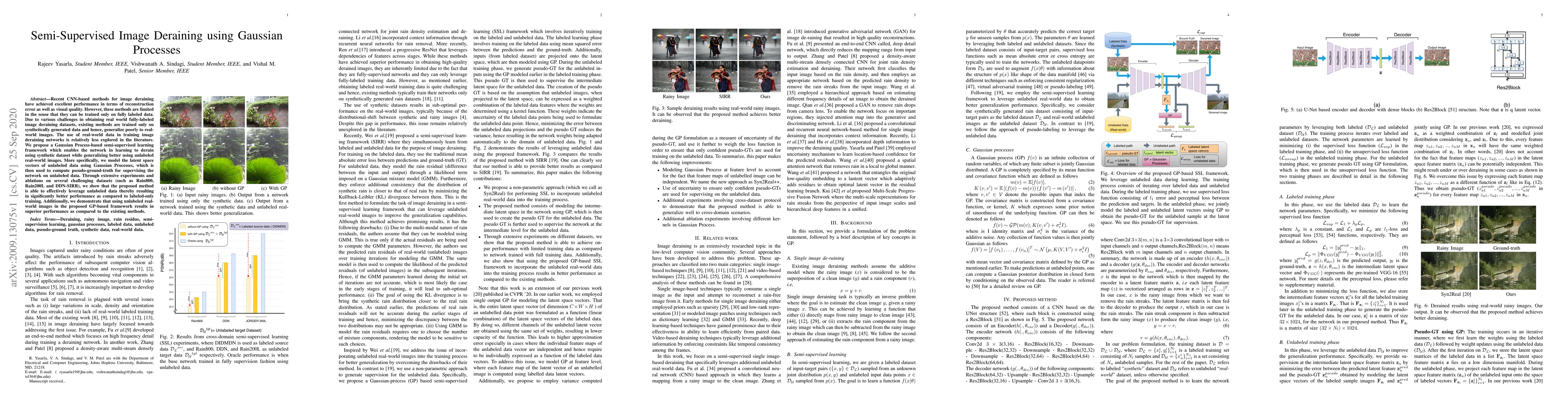 The paper proposes a Gaussian Process-based semi-supervised learning framework for image deraining, enabling networks to learn from synthetic data while leveraging unlabeled real-world images for better generalization. The method uses Gaussian Processes to model latent vectors of unlabeled data, generating pseudo-ground-truth for additional supervision, leading to improved performance over fully labeled training.