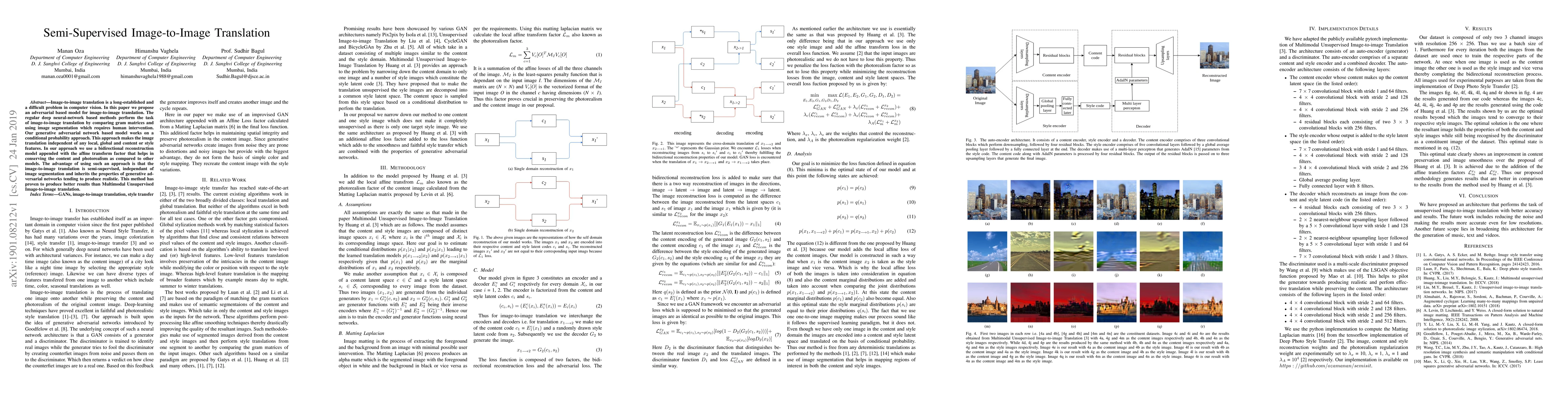 This paper proposes a semi-supervised image-to-image translation model based on a generative adversarial network (GAN) using a conditional probability approach, which is independent of segmentation and produces realistic results. The method employs a bidirectional reconstruction model with an affine transform to maintain content and photorealism.
