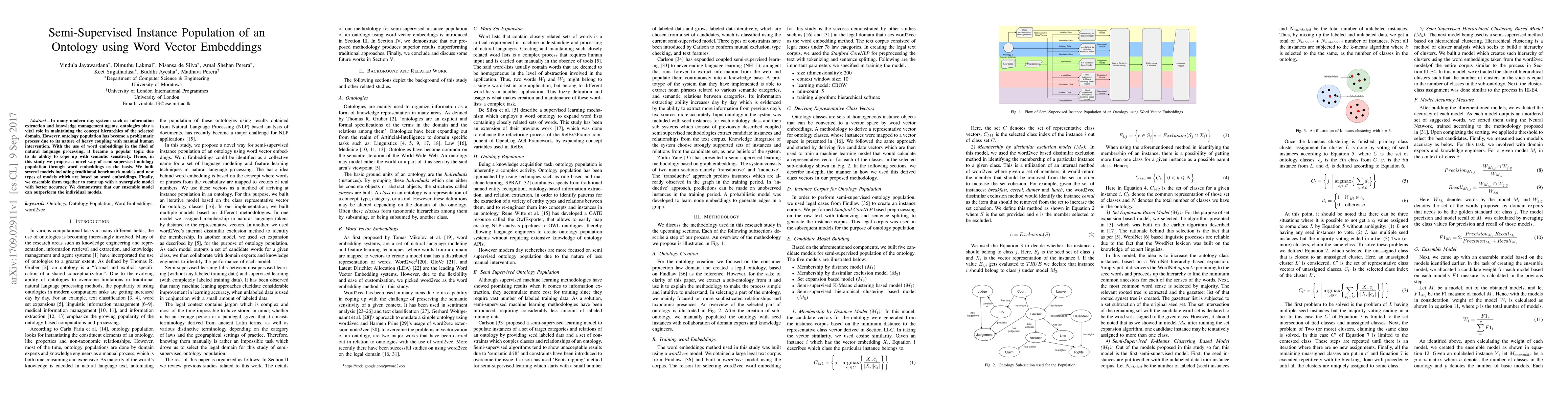 This paper proposes a semi-supervised method for populating ontologies using word vector embeddings, aiming to reduce manual intervention. An ensemble of traditional and word embedding-based models is developed and shown to outperform individual models in ontology population accuracy.
