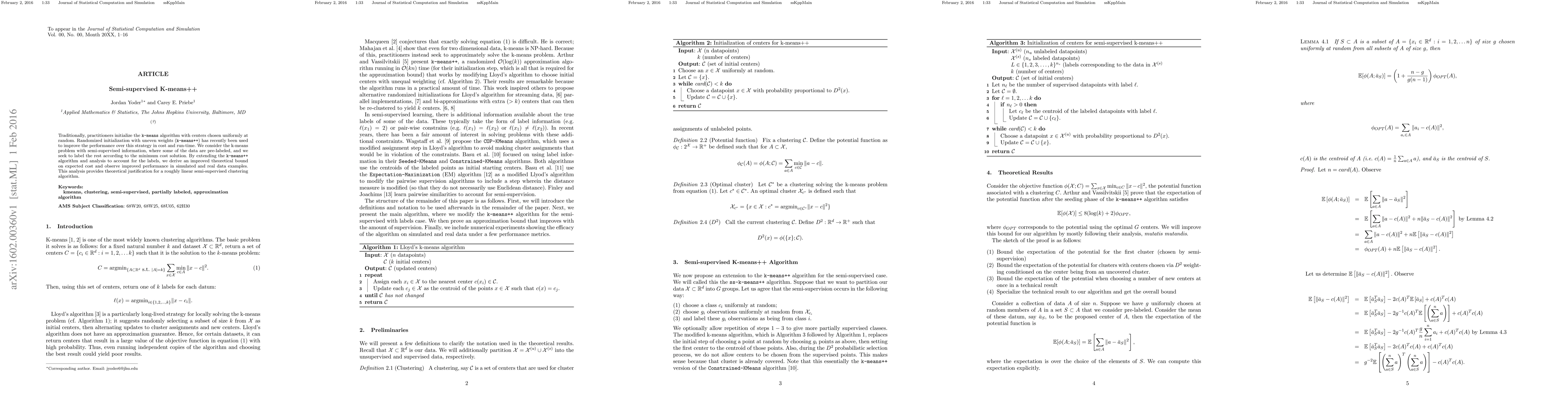 Traditionally, practitioners initialize the {\tt k-means} algorithm with centers chosen uniformly at random. Randomized initialization with uneven weights ({\tt k-means++}) has recently been used to improve the performance over this strategy in cost and run-time. We consider the k-means problem with semi-supervised information, where some of the data are pre-labeled, and we seek to label the rest according to the minimum cost solution. By extending the {\tt k-means++} algorithm and analysis to account for the labels, we derive an improved theoretical bound on expected cost and observe improved performance in simulated and real data examples. This analysis provides theoretical justification for a roughly linear semi-supervised clustering algorithm.