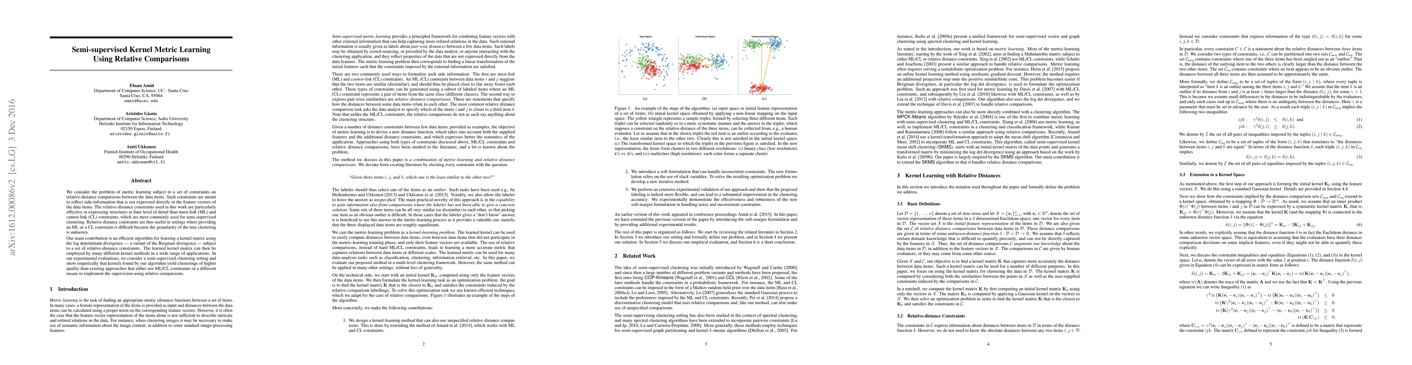 This paper presents an efficient algorithm for semi-supervised kernel metric learning using relative-distance comparisons, which provides finer detail than traditional must-link/cannot-link constraints. The proposed method learns a kernel matrix via log determinant divergence, achieving higher quality clustering in experiments compared to existing methods.