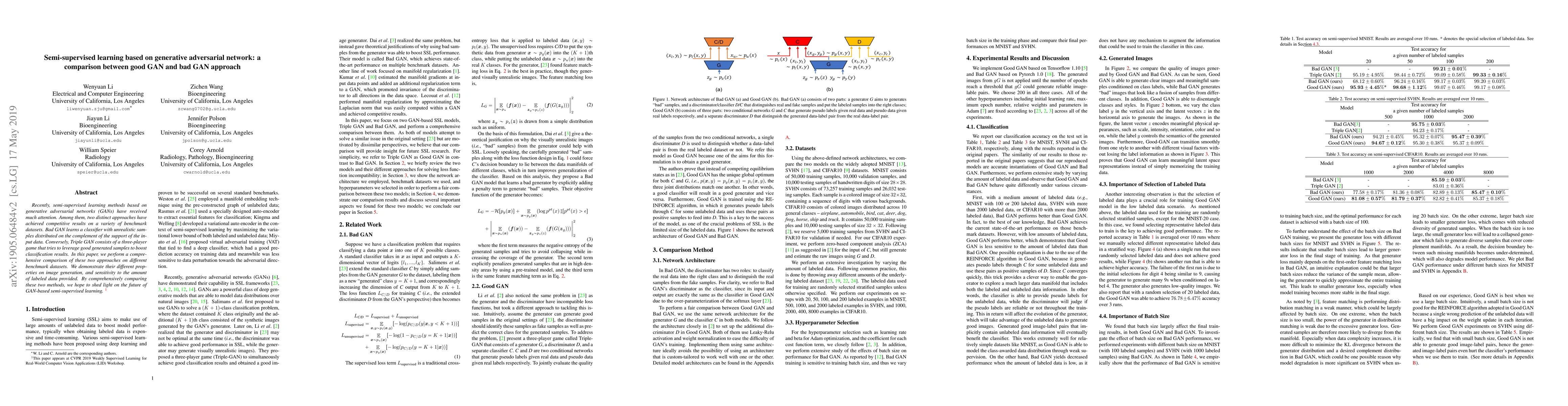 This paper compares two semi-supervised learning approaches based on GANs: the Bad GAN, which uses unrealistic samples, and the Triple GAN, which leverages realistic samples for better classification. The study evaluates their performance on various datasets, highlighting their distinct properties and sensitivity to labeled data.