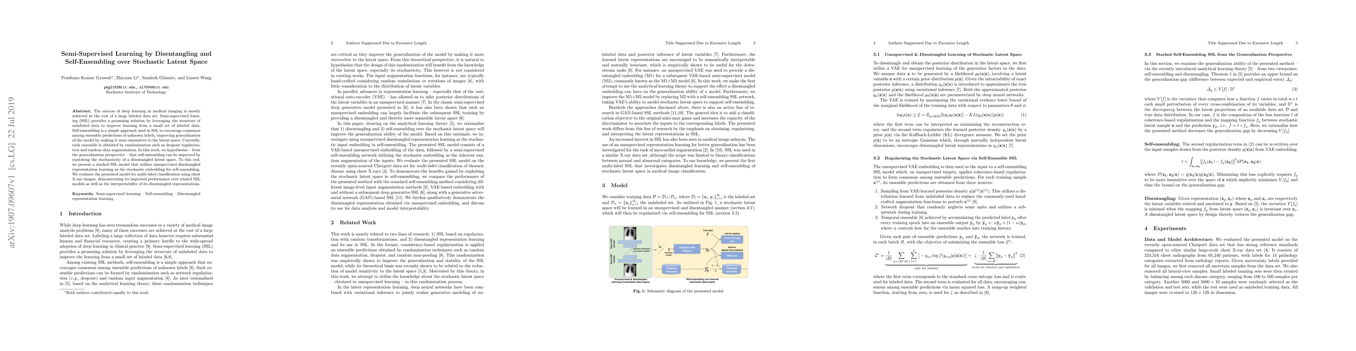 The success of deep learning in medical imaging is mostly achieved at the cost of a large labeled data set. Semi-supervised learning (SSL) provides a promising solution by leveraging the structure of unlabeled data to improve learning from a small set of labeled data. Self-ensembling is a simple approach used in SSL to encourage consensus among ensemble predictions of unknown labels, improving generalization of the model by making it more insensitive to the latent space. Currently, such an ensemble is obtained by randomization such as dropout regularization and random data augmentation. In this work, we hypothesize -- from the generalization perspective -- that self-ensembling can be improved by exploiting the stochasticity of a disentangled latent space. To this end, we present a stacked SSL model that utilizes unsupervised disentangled representation learning as the stochastic embedding for self-ensembling. We evaluate the presented model for multi-label classification using chest X-ray images, demonstrating its improved performance over related SSL models as well as the interpretability of its disentangled representations.