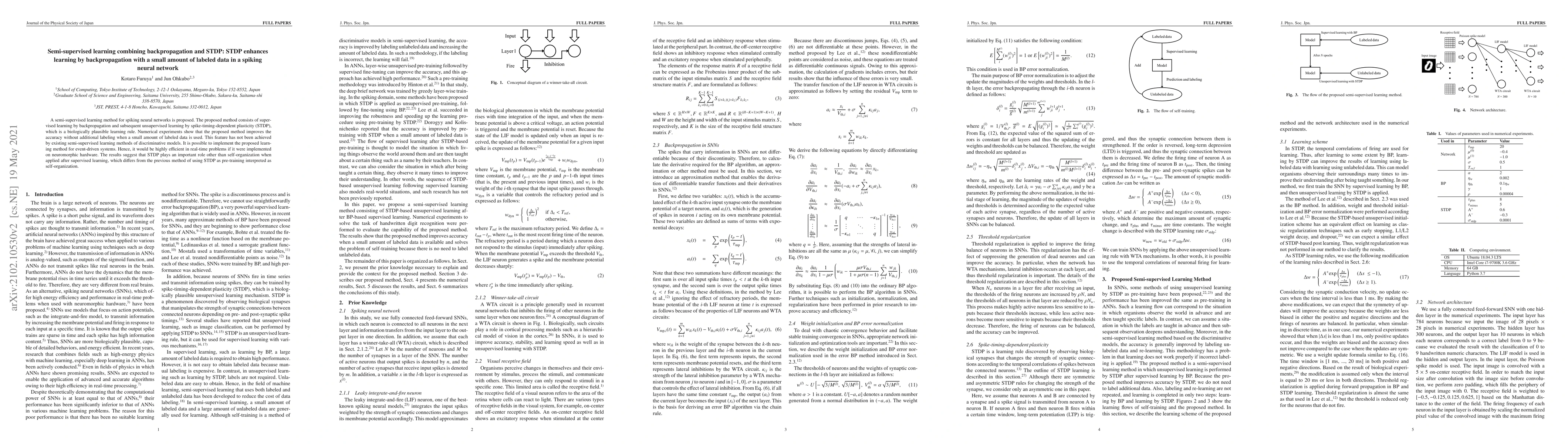 This paper proposes a semi-supervised learning method for spiking neural networks that combines backpropagation with spike-timing-dependent plasticity (STDP). It demonstrates that STDP enhances learning accuracy with minimal labeled data, outperforming existing semi-supervised methods, and suggests potential for real-time efficiency on neuromorphic hardware.