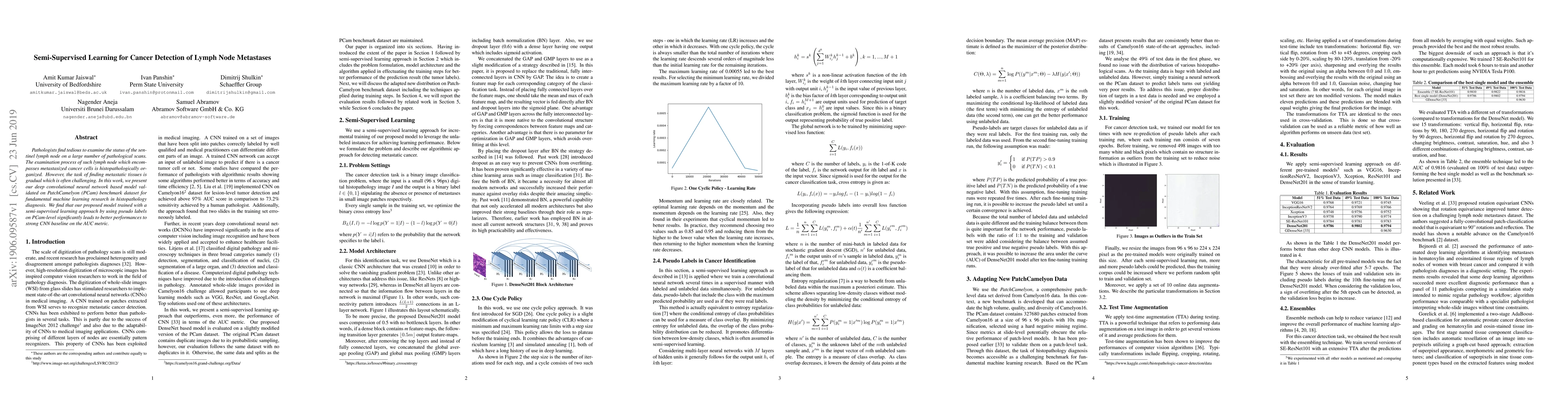 This paper proposes a deep convolutional neural network for detecting lymph node metastases in histopathology scans, utilizing a semi-supervised learning approach with pseudo labels on the PatchCamelyon dataset. The model shows improved performance over a strong CNN baseline, particularly in AUC metrics.