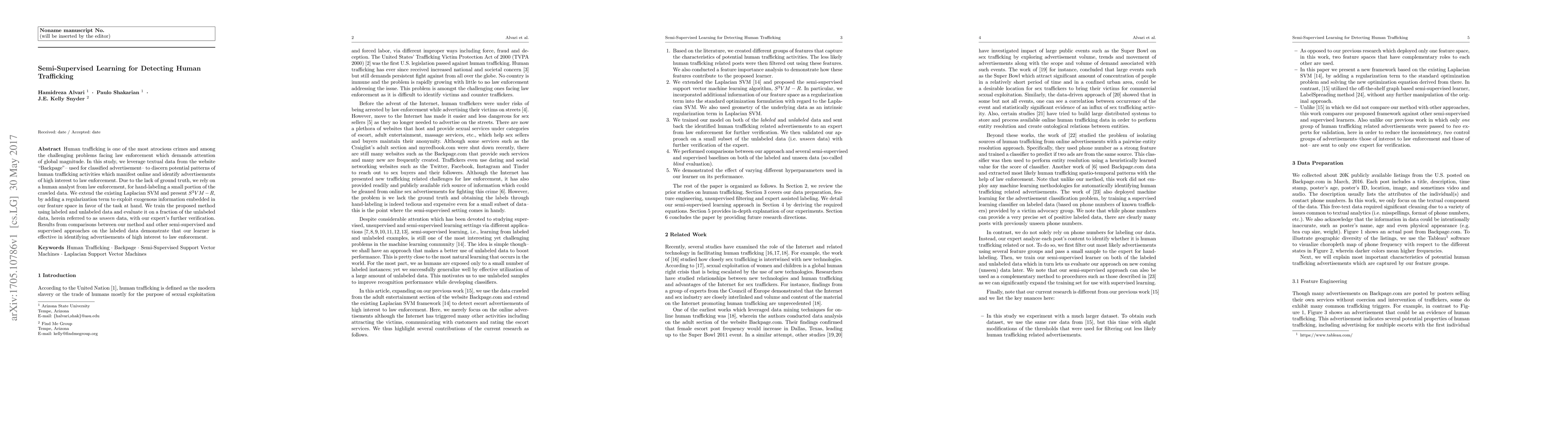 This paper proposes S3VM-R, a semi-supervised learning method for detecting human trafficking in online classified advertisements, leveraging both labeled and unlabeled data. The method outperforms other approaches in identifying suspicious ads, validated by law enforcement experts.