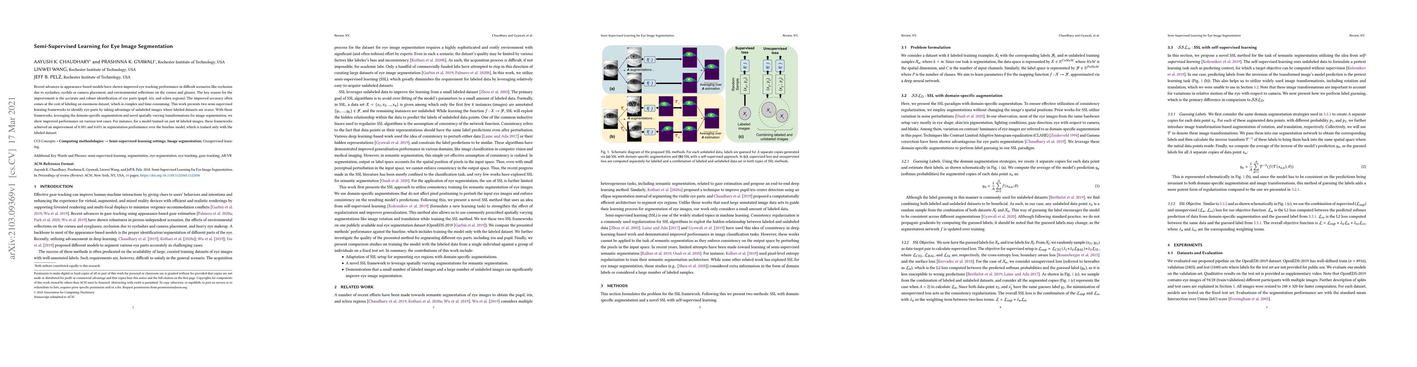 Recent advances in appearance-based models have shown improved eye tracking performance in difficult scenarios like occlusion due to eyelashes, eyelids or camera placement, and environmental reflections on the cornea and glasses. The key reason for the improvement is the accurate and robust identification of eye parts (pupil, iris, and sclera regions). The improved accuracy often comes at the cost of labeling an enormous dataset, which is complex and time-consuming. This work presents two semi-supervised learning frameworks to identify eye-parts by taking advantage of unlabeled images where labeled datasets are scarce. With these frameworks, leveraging the domain-specific augmentation and novel spatially varying transformations for image segmentation, we show improved performance on various test cases. For instance, for a model trained on just 48 labeled images, these frameworks achieved an improvement of 0.38% and 0.65% in segmentation performance over the baseline model, which is trained only with the labeled dataset.