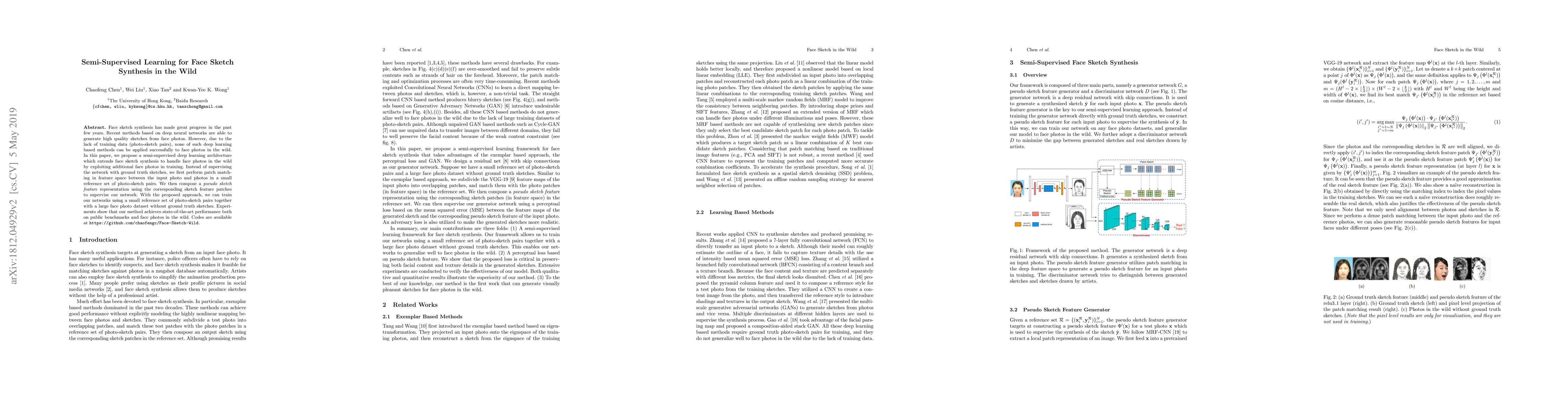 This paper introduces a semi-supervised deep learning method for synthesizing face sketches from photos in the wild, overcoming the scarcity of photo-sketch training pairs. By leveraging patch matching and pseudo sketch feature representations, the method achieves state-of-the-art performance on both benchmarks and real-world face photos.