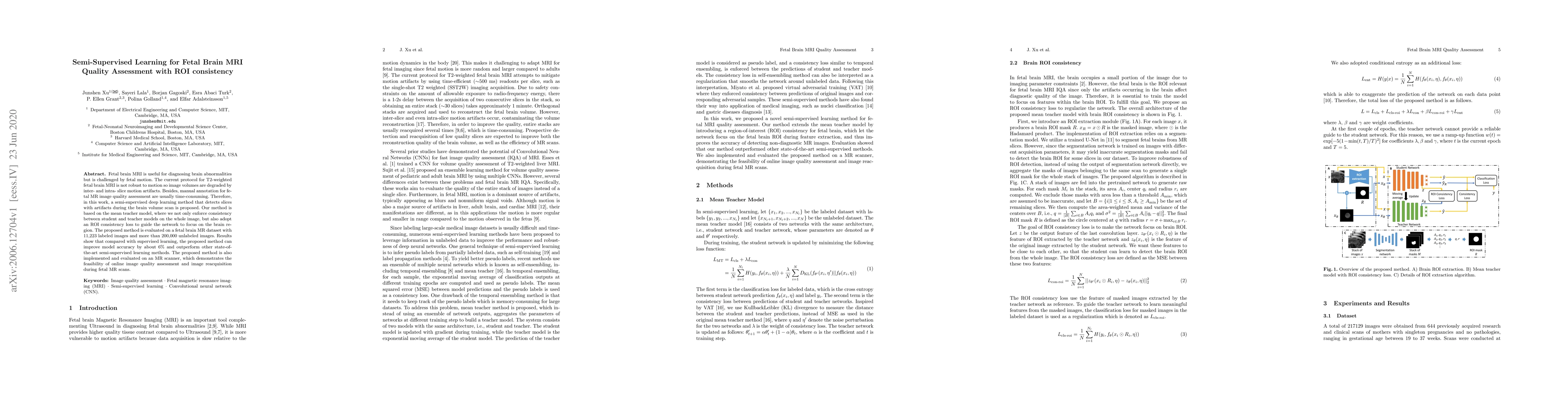 This paper proposes a semi-supervised deep learning method for assessing fetal brain MRI quality, focusing on detecting motion artifacts. The method uses a mean teacher model with ROI consistency loss, achieving a 6% improvement in accuracy over supervised learning and demonstrating feasibility for online assessment during MR scans.