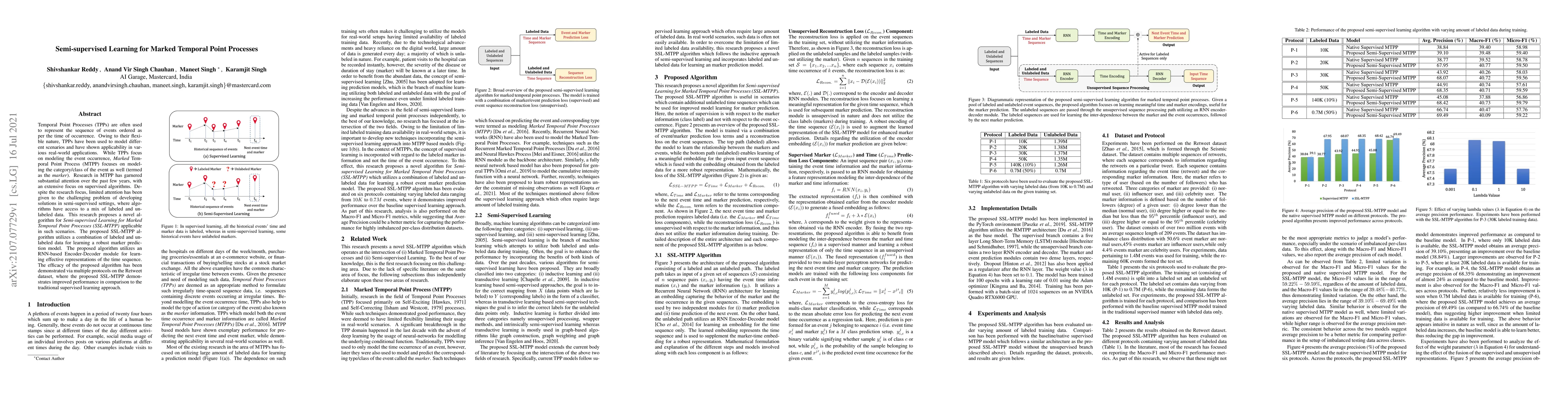 This paper proposes a novel semi-supervised learning algorithm for Marked Temporal Point Processes (MTPP), utilizing both labeled and unlabeled data to enhance marker prediction. The algorithm employs an RNN-based Encoder-Decoder for effective time sequence representation, showing improved performance on the Retweet dataset compared to traditional supervised methods.