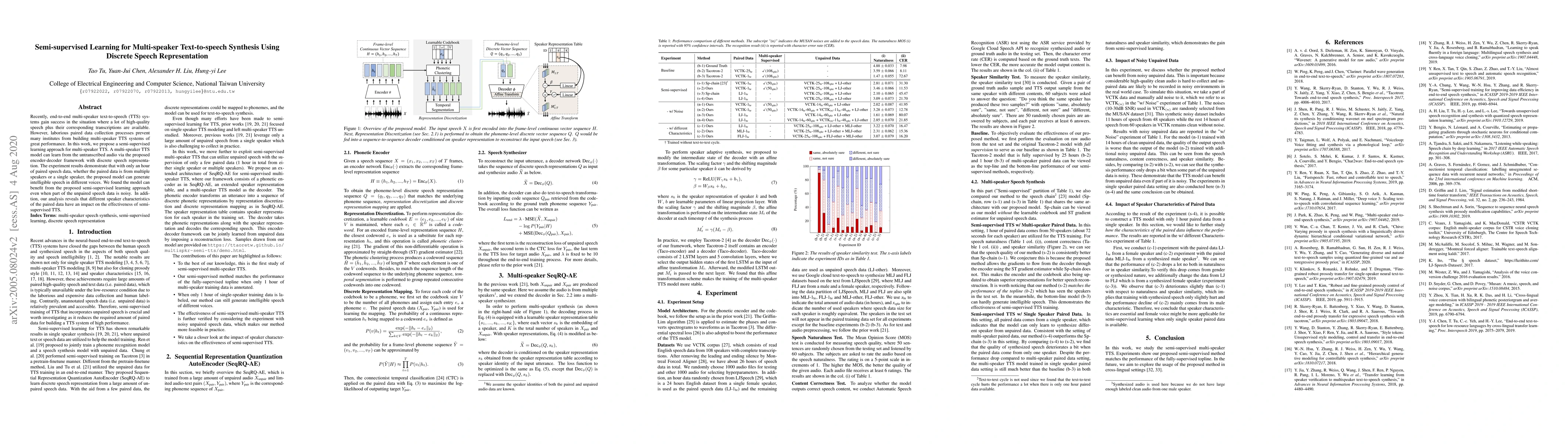 This paper proposes a semi-supervised learning method for multi-speaker text-to-speech synthesis using discrete speech representation, enabling effective training with limited paired data and untranscribed audio. Experimental results show the model can generate intelligible speech from an hour of paired data, regardless of its source, and benefits from noisy unpaired data.