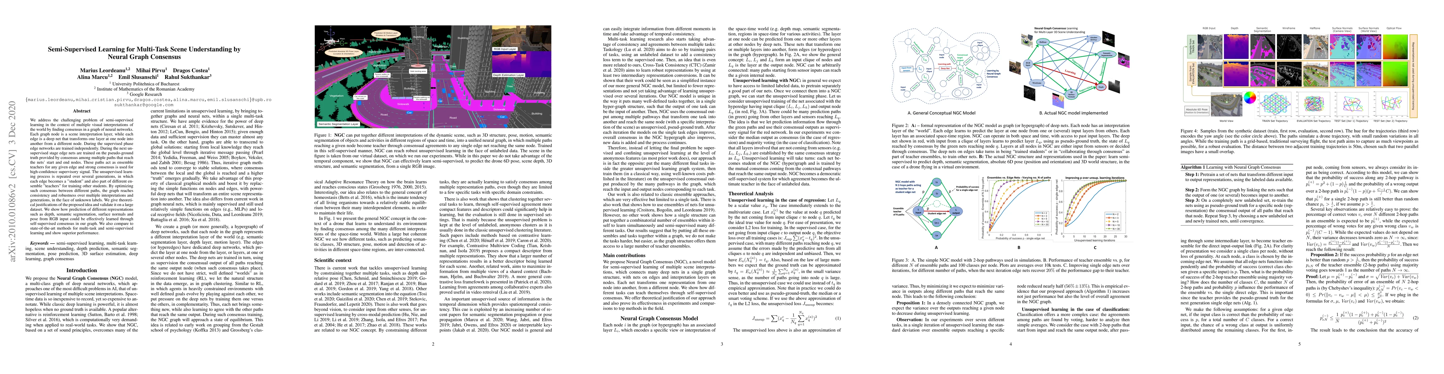 This paper proposes a semi-supervised learning method that uses neural graph consensus to learn multiple visual interpretations of scenes, achieving superior performance in multi-task and semi-supervised learning tasks.