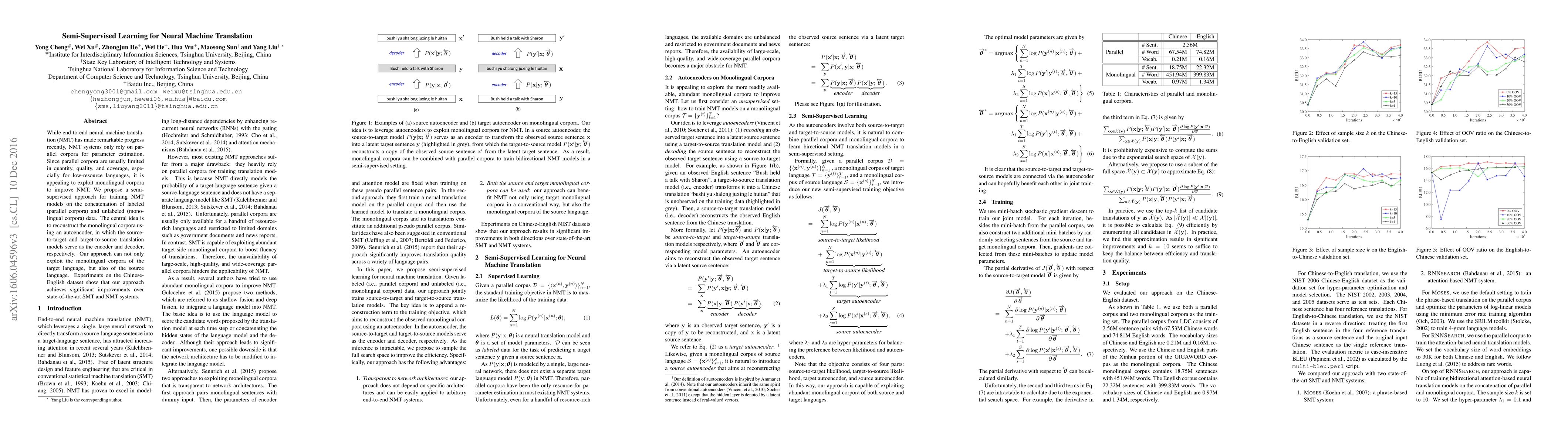 This paper proposes a semi-supervised learning method for neural machine translation (NMT) that leverages both parallel and monolingual corpora to enhance model performance, especially for low-resource languages. The approach uses an autoencoder to reconstruct monolingual data, achieving significant improvements over traditional NMT and SMT systems in experiments on Chinese-English translation.