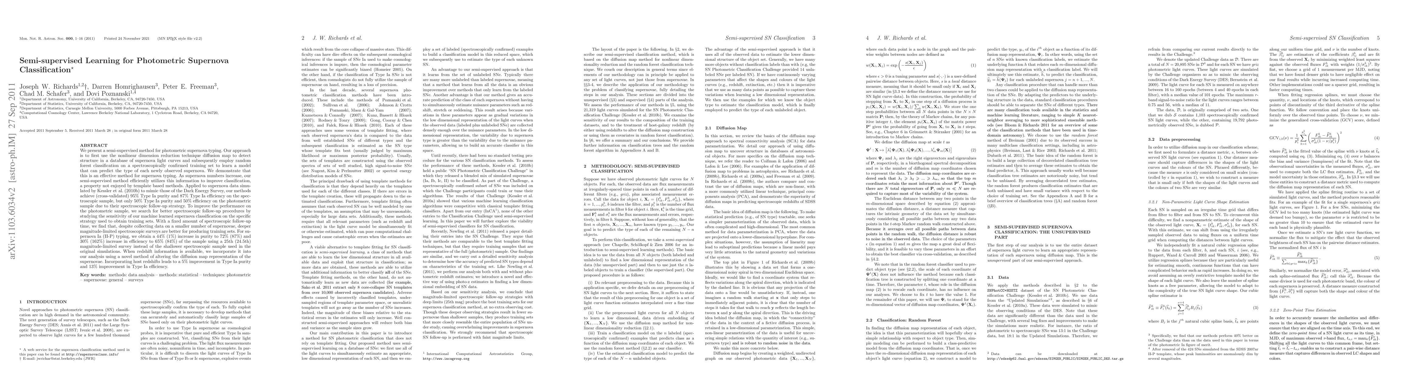 This paper introduces a semi-supervised method for classifying supernovae using diffusion maps and random forests, achieving high accuracy on spectroscopic samples. It demonstrates improved performance over template-based methods and shows that deeper magnitude-limited surveys enhance classification efficiency and purity.