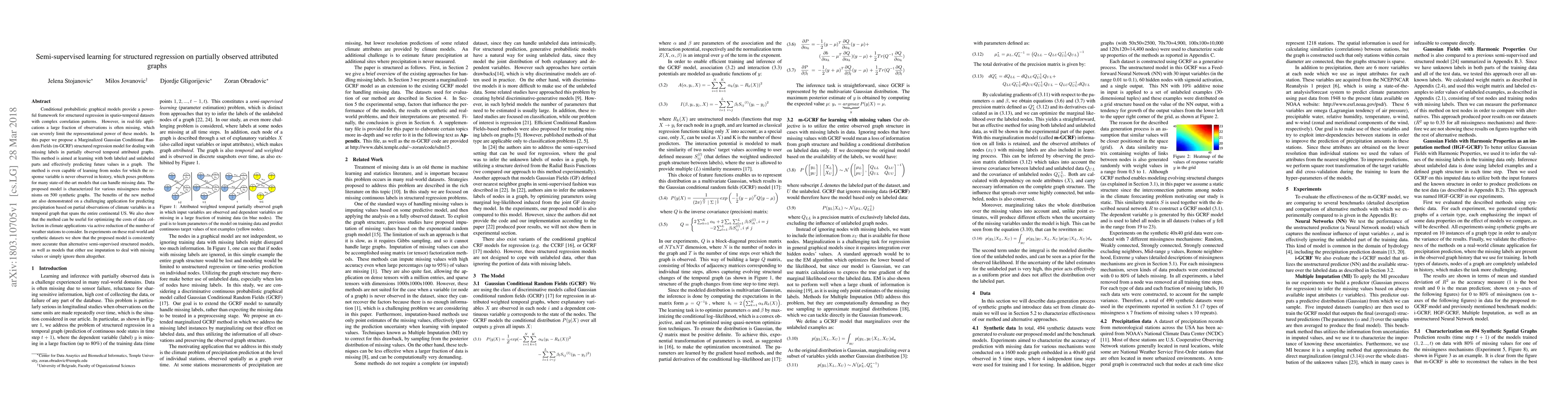 This paper proposes a Marginalized Gaussian Conditional Random Fields (m-GCRF) model for structured regression on partially observed temporal attributed graphs, effectively handling missing labels and improving predictions. The method outperforms alternative semi-supervised models and is demonstrated through applications in predicting precipitation and optimizing data collection costs in climate studies.