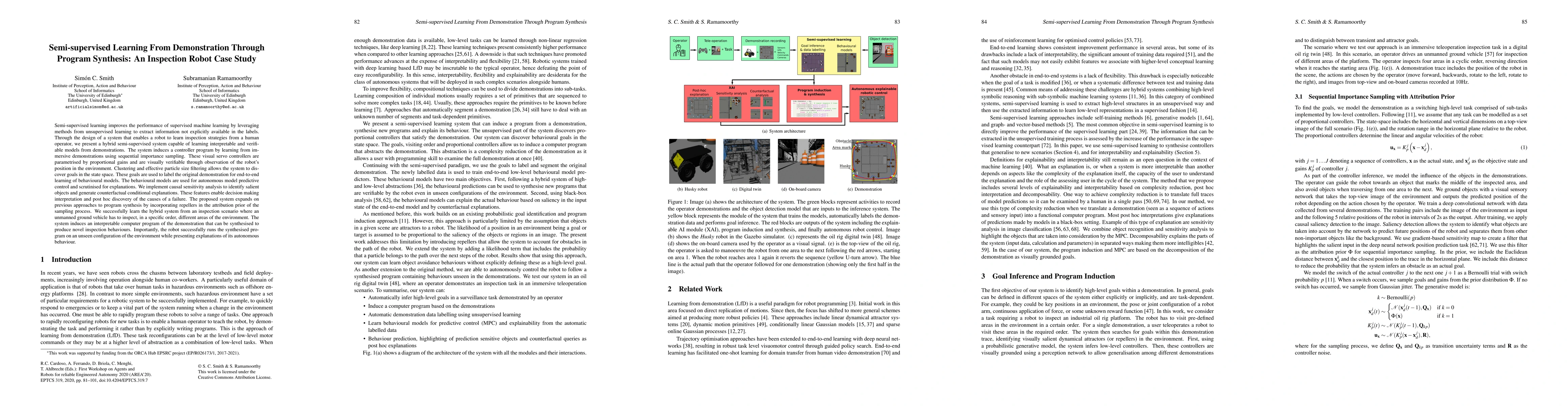 Semi-supervised learning improves the performance of supervised machine learning by leveraging methods from unsupervised learning to extract information not explicitly available in the labels. Through the design of a system that enables a robot to learn inspection strategies from a human operator, we present a hybrid semi-supervised system capable of learning interpretable and verifiable models from demonstrations. The system induces a controller program by learning from immersive demonstrations using sequential importance sampling. These visual servo controllers are parametrised by proportional gains and are visually verifiable through observation of the position of the robot in the environment. Clustering and effective particle size filtering allows the system to discover goals in the state space. These goals are used to label the original demonstration for end-to-end learning of behavioural models. The behavioural models are used for autonomous model predictive control and scrutinised for explanations. We implement causal sensitivity analysis to identify salient objects and generate counterfactual conditional explanations. These features enable decision making interpretation and post hoc discovery of the causes of a failure. The proposed system expands on previous approaches to program synthesis by incorporating repellers in the attribution prior of the sampling process. We successfully learn the hybrid system from an inspection scenario where an unmanned ground vehicle has to inspect, in a specific order, different areas of the environment. The system induces an interpretable computer program of the demonstration that can be synthesised to produce novel inspection behaviours. Importantly, the robot successfully runs the synthesised program on an unseen configuration of the environment while presenting explanations of its autonomous behaviour.