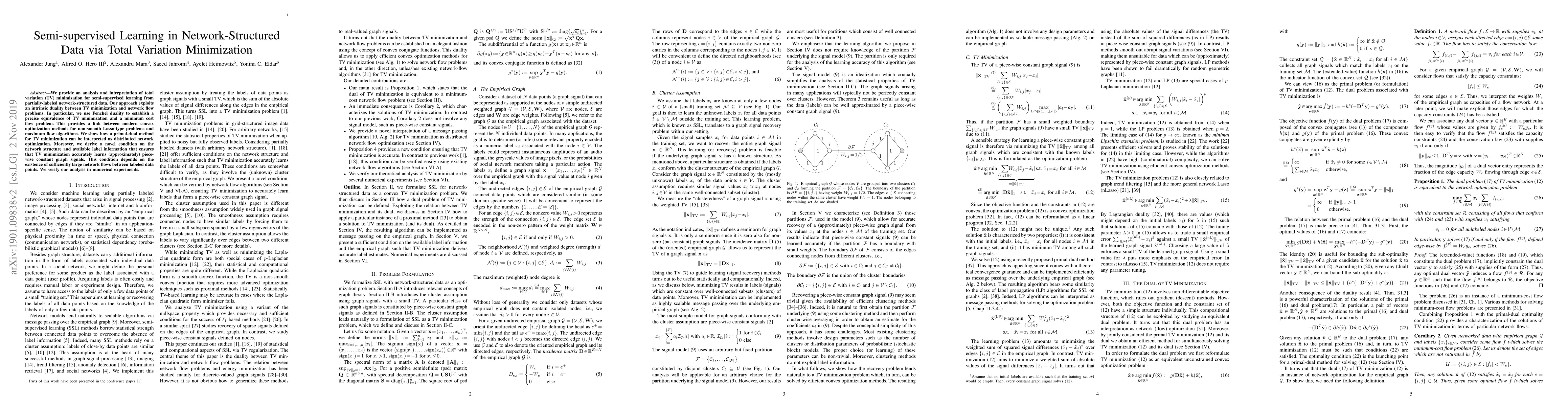 We propose and analyze a method for semi-supervised learning from partially-labeled network-structured data. Our approach is based on a graph signal recovery interpretation under a clustering hypothesis that labels of data points belonging to the same well-connected subset (cluster) are similar valued. This lends naturally to learning the labels by total variation (TV) minimization, which we solve by applying a recently proposed primal-dual method for non-smooth convex optimization. The resulting algorithm allows for a highly scalable implementation using message passing over the underlying empirical graph, which renders the algorithm suitable for big data applications. By applying tools of compressed sensing, we derive a sufficient condition on the underlying network structure such that TV minimization recovers clusters in the empirical graph of the data. In particular, we show that the proposed primal-dual method amounts to maximizing network flows over the empirical graph of the dataset. Moreover, the learning accuracy of the proposed algorithm is linked to the set of network flows between data points having known labels. The effectiveness and scalability of our approach is verified by numerical experiments.