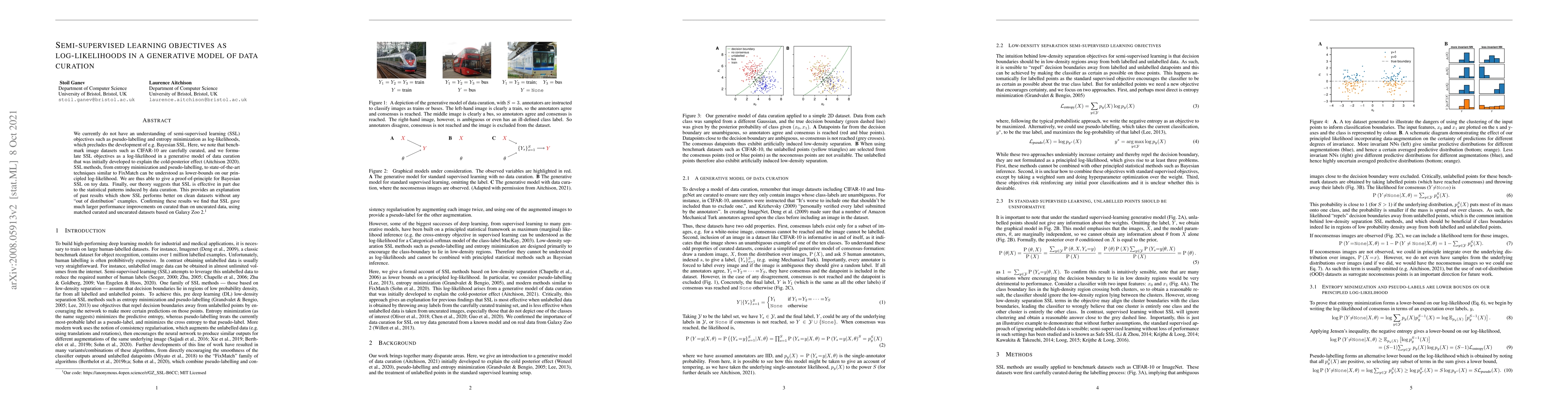 We currently do not have an understanding of semi-supervised learning (SSL) objectives such as pseudo-labelling and entropy minimization as log-likelihoods, which precludes the development of e.g. Bayesian SSL. Here, we note that benchmark image datasets such as CIFAR-10 are carefully curated, and we formulate SSL objectives as a log-likelihood in a generative model of data curation that was initially developed to explain the cold-posterior effect (Aitchison 2020). SSL methods, from entropy minimization and pseudo-labelling, to state-of-the-art techniques similar to FixMatch can be understood as lower-bounds on our principled log-likelihood. We are thus able to give a proof-of-principle for Bayesian SSL on toy data. Finally, our theory suggests that SSL is effective in part due to the statistical patterns induced by data curation. This provides an explanation of past results which show SSL performs better on clean datasets without any "out of distribution" examples. Confirming these results we find that SSL gave much larger performance improvements on curated than on uncurated data, using matched curated and uncurated datasets based on Galaxy Zoo 2.