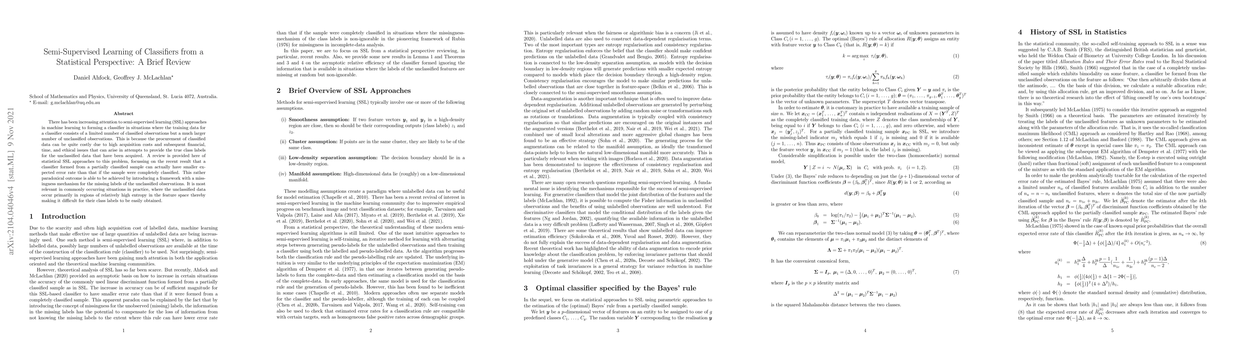 There has been increasing attention to semi-supervised learning (SSL) approaches in machine learning to forming a classifier in situations where the training data for a classifier consists of a limited number of classified observations but a much larger number of unclassified observations. This is because the procurement of classified data can be quite costly due to high acquisition costs and subsequent financial, time, and ethical issues that can arise in attempts to provide the true class labels for the unclassified data that have been acquired. We provide here a review of statistical SSL approaches to this problem, focussing on the recent result that a classifier formed from a partially classified sample can actually have smaller expected error rate than that if the sample were completely classified.