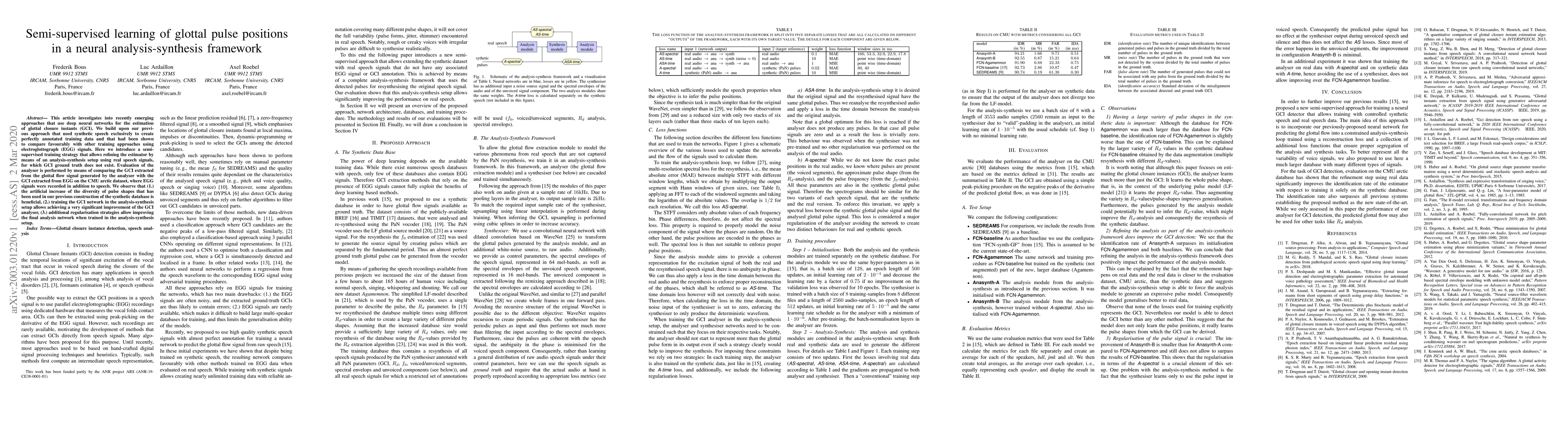 This article investigates into recently emerging approaches that use deep neural networks for the estimation of glottal closure instants (GCI). We build upon our previous approach that used synthetic speech exclusively to create perfectly annotated training data and that had been shown to compare favourably with other training approaches using electroglottograph (EGG) signals. Here we introduce a semi-supervised training strategy that allows refining the estimator by means of an analysis-synthesis setup using real speech signals, for which GCI ground truth does not exist. Evaluation of the analyser is performed by means of comparing the GCI extracted from the glottal flow signal generated by the analyser with the GCI extracted from EGG on the CMU arctic dataset, where EGG signals were recorded in addition to speech. We observe that (1.) the artificial increase of the diversity of pulse shapes that has been used in our previous construction of the synthetic database is beneficial, (2.) training the GCI network in the analysis-synthesis setup allows achieving a very significant improvement of the GCI analyser, (3.) additional regularisation strategies allow improving the final analysis network when trained in the analysis-synthesis setup.