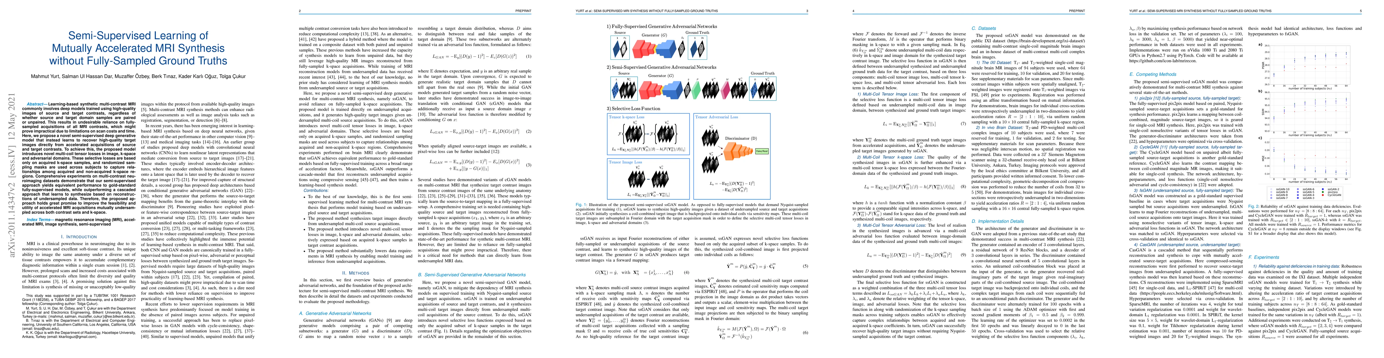 This paper proposes a novel semi-supervised deep generative model for synthesizing high-quality multi-contrast MRI images from accelerated acquisitions, eliminating the need for fully-sampled ground truths. The model employs multi-coil tensor losses in image, k-space, and adversarial domains to achieve this, demonstrating equivalent performance to fully-supervised models while improving feasibility for accelerated MRI.