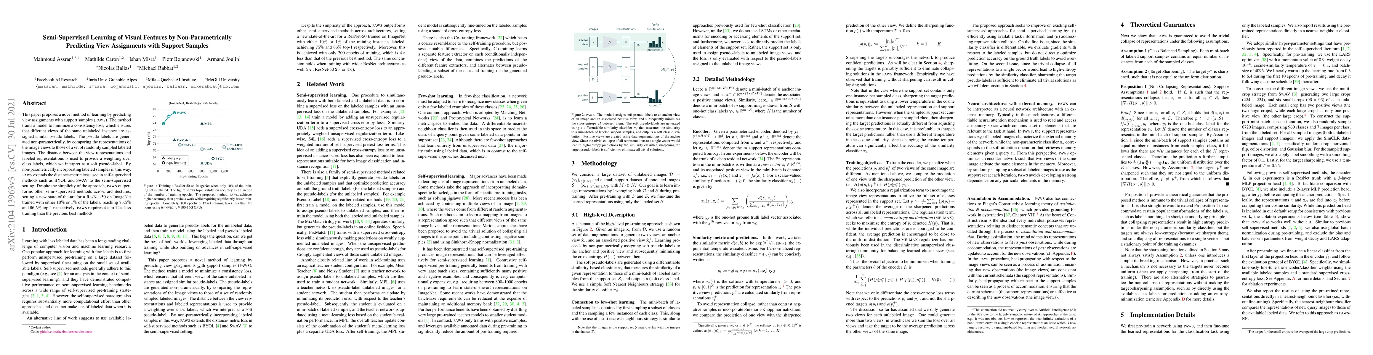 This paper proposes a novel method of learning by predicting view assignments with support samples (PAWS). The method trains a model to minimize a consistency loss, which ensures that different views of the same unlabeled instance are assigned similar pseudo-labels. The pseudo-labels are generated non-parametrically, by comparing the representations of the image views to those of a set of randomly sampled labeled images. The distance between the view representations and labeled representations is used to provide a weighting over class labels, which we interpret as a soft pseudo-label. By non-parametrically incorporating labeled samples in this way, PAWS extends the distance-metric loss used in self-supervised methods such as BYOL and SwAV to the semi-supervised setting. Despite the simplicity of the approach, PAWS outperforms other semi-supervised methods across architectures, setting a new state-of-the-art for a ResNet-50 on ImageNet trained with either 10% or 1% of the labels, reaching 75.5% and 66.5% top-1 respectively. PAWS requires 4x to 12x less training than the previous best methods.