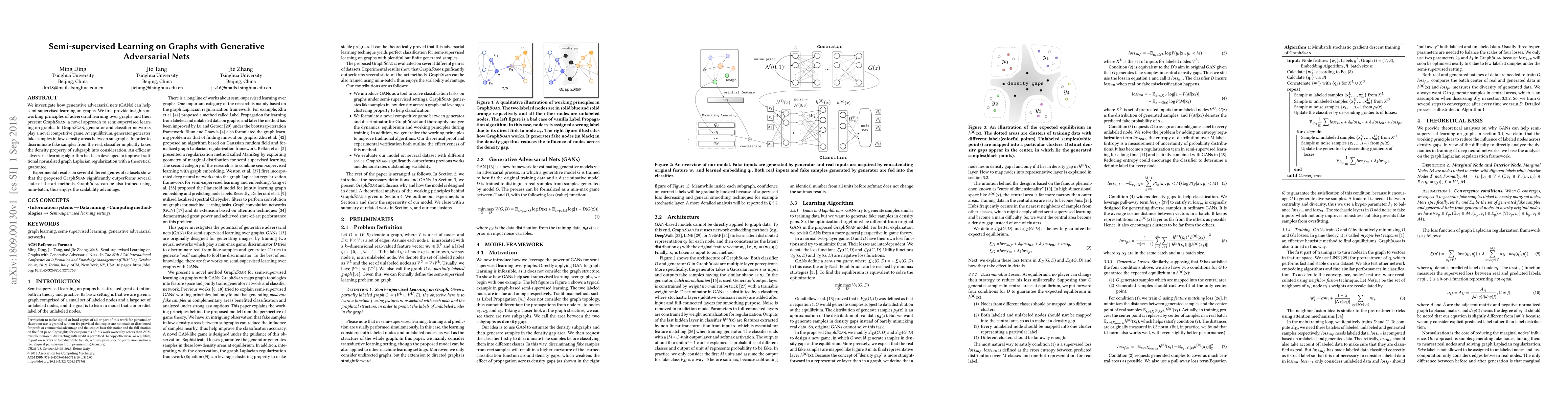 This paper explores the use of generative adversarial nets (GANs) for semi-supervised learning on graphs, introducing GraphSGAN. It demonstrates that the generator creates fake samples in low-density areas, while the classifier considers subgraph density, leading to superior performance over existing methods.