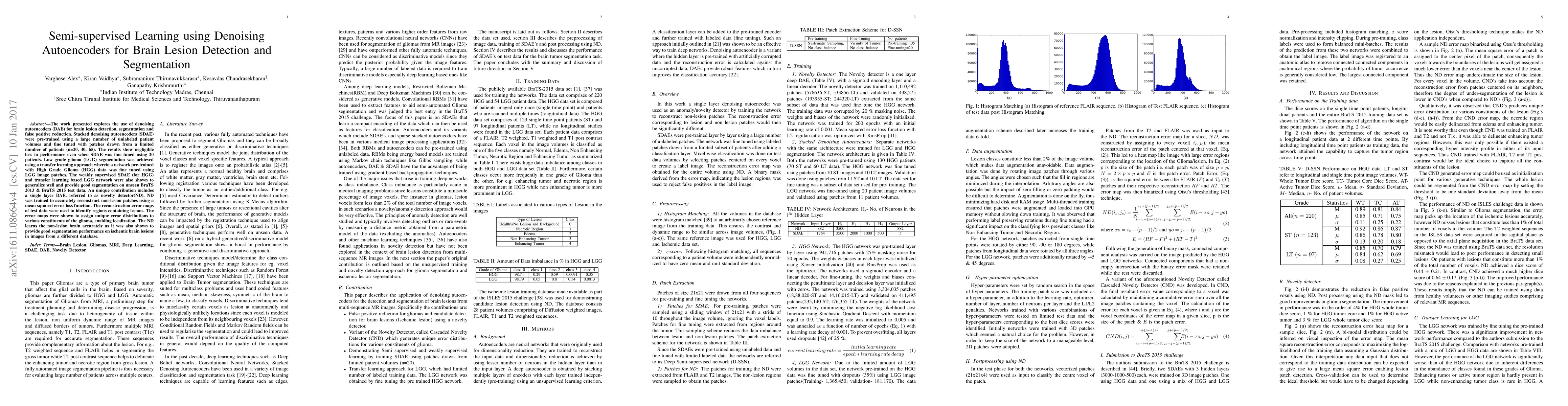 This paper investigates semi-supervised learning using denoising autoencoders for brain lesion detection and segmentation. It employs stacked denoising autoencoders pre-trained on unlabeled data and fine-tuned on a limited labeled dataset, demonstrating effective segmentation and false positive reduction.