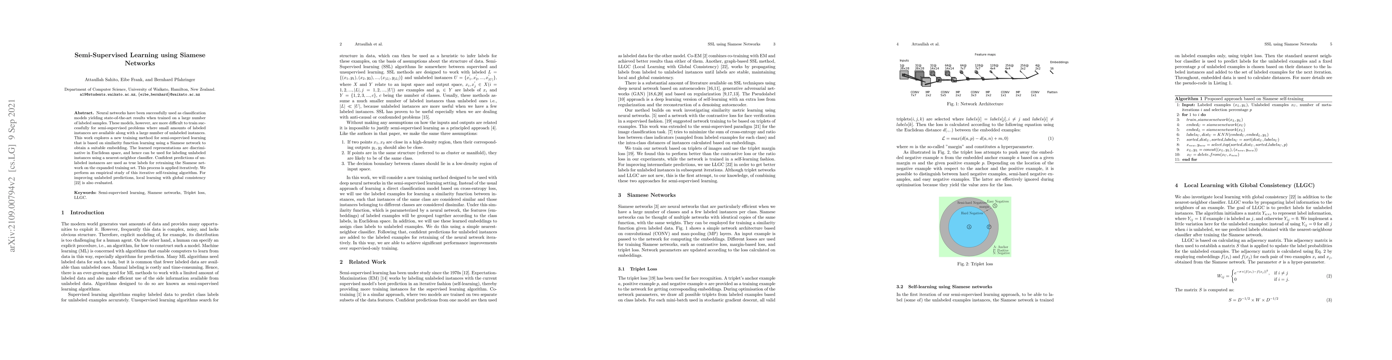 This paper proposes a semi-supervised learning method using Siamese networks to embed data, enabling the labeling of unlabeled instances via nearest-neighbor classification. The iterative self-training approach refines the network with confident predictions, enhanced by local learning with global consistency.
